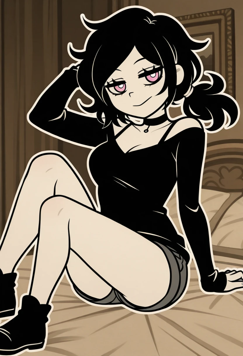 black pendant choker, bra strap, off-shoulder black shirt, long sleeves, short shorts, shoes