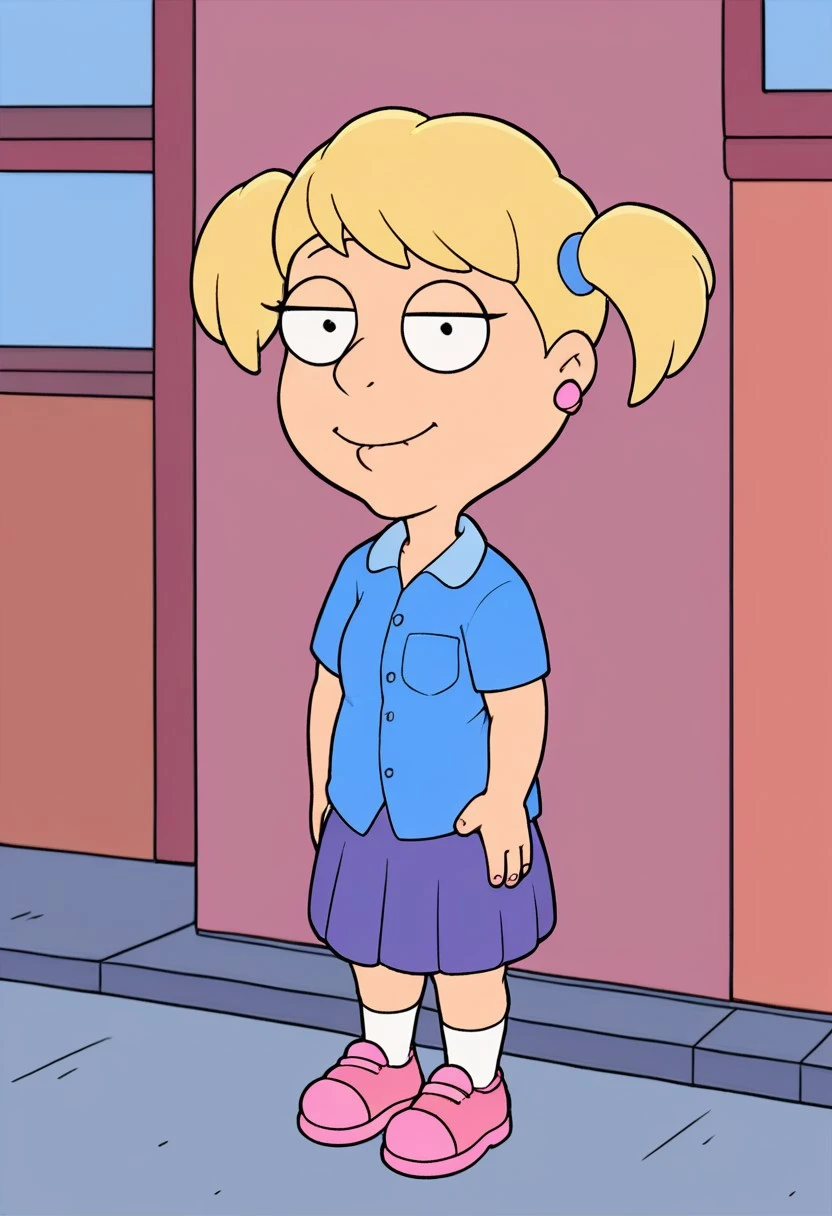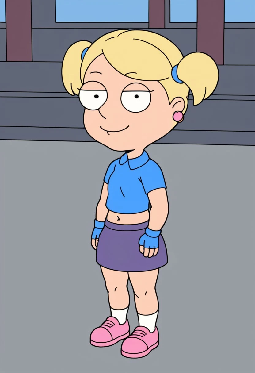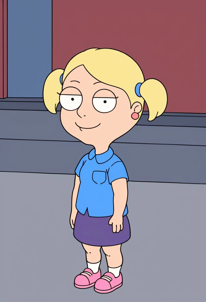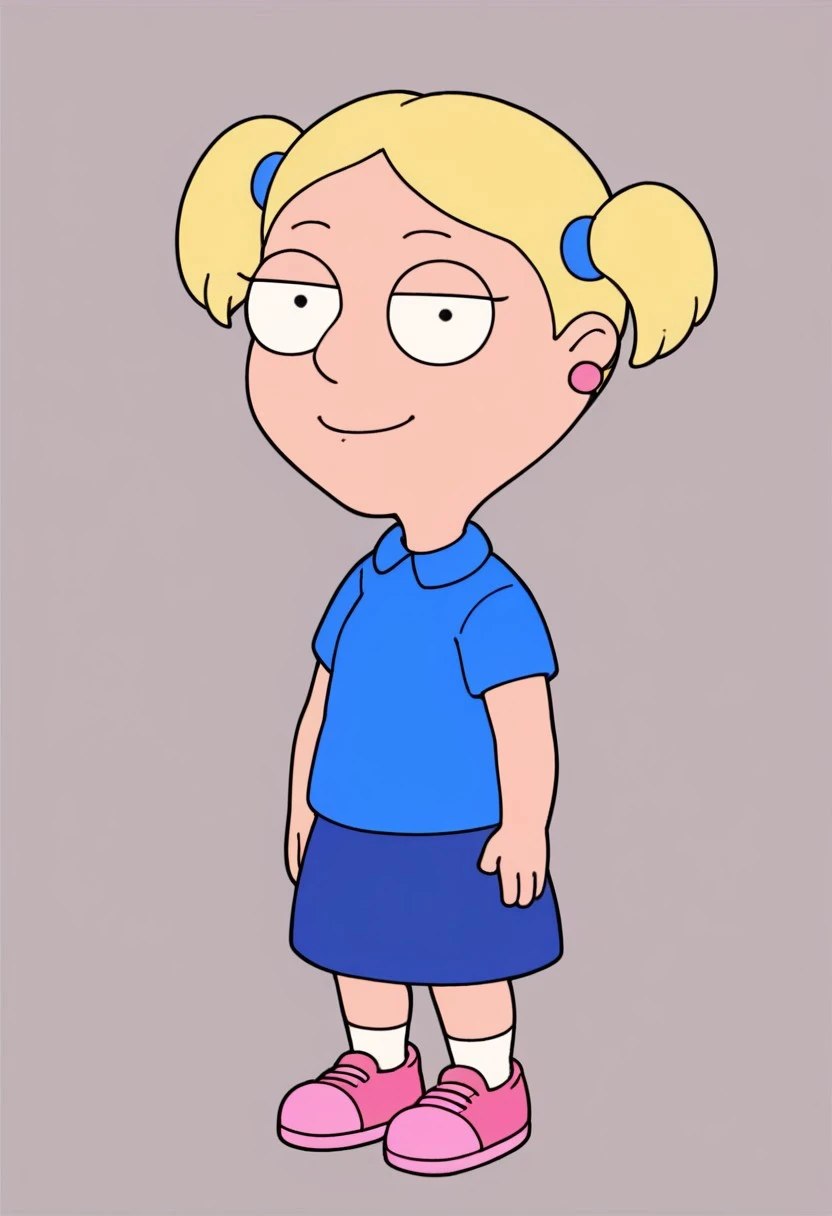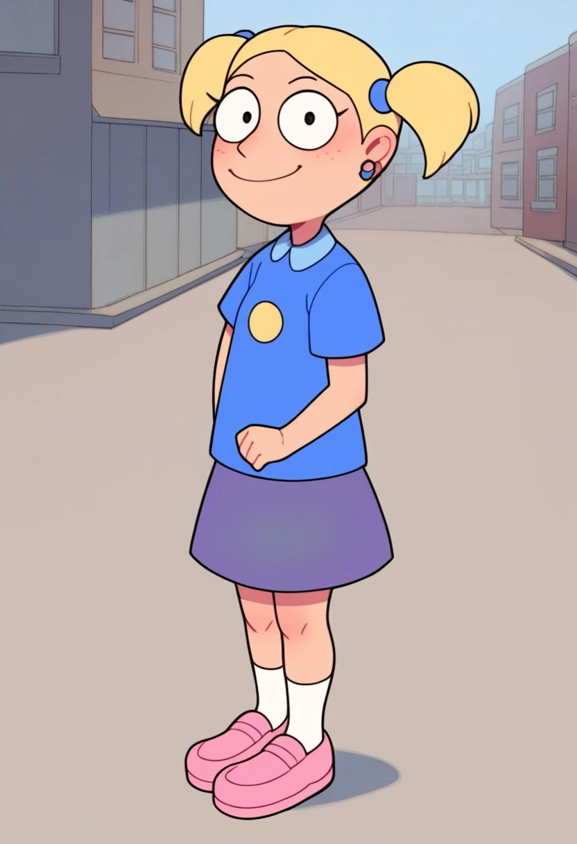 Susie_ad, 1girl, solo, rounded eyes, dot pupils, blonde hair, short twintails, earrings, blue shirt, purple skirt, socks, pink shoes