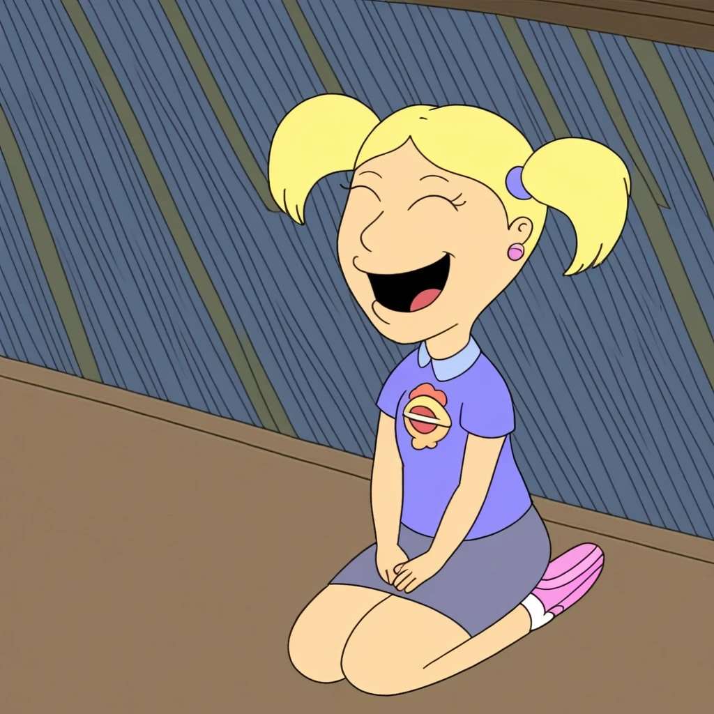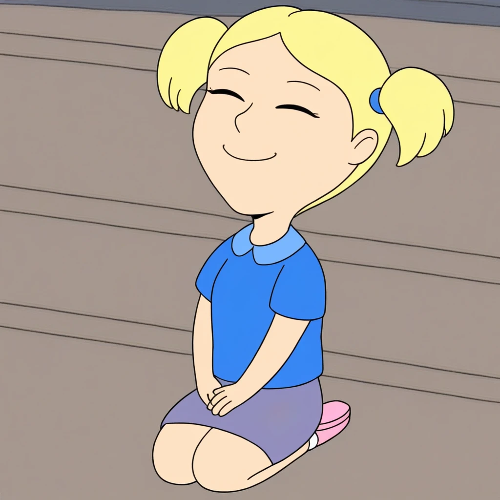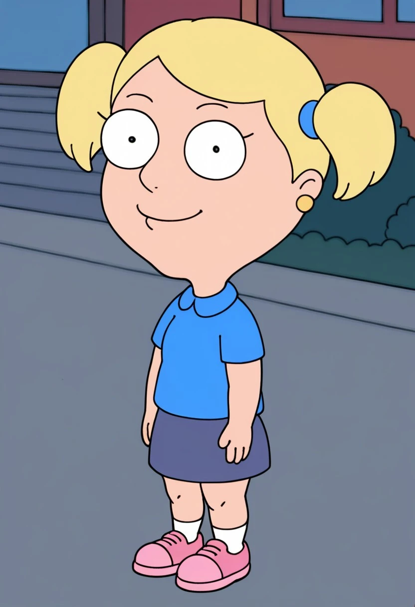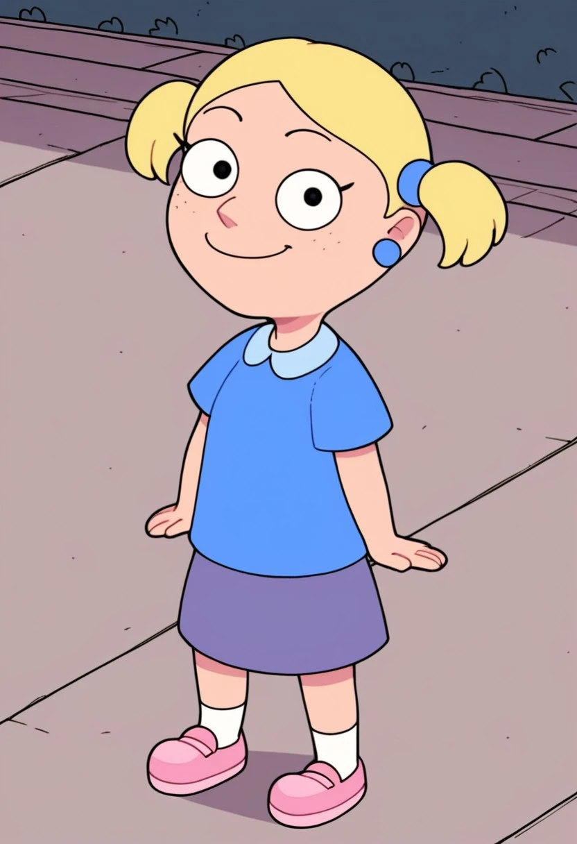 Susie_ad, 1girl, solo, rounded eyes, dot pupils, blonde hair, short twintails, earrings, blue shirt, purple skirt, socks, pink shoes