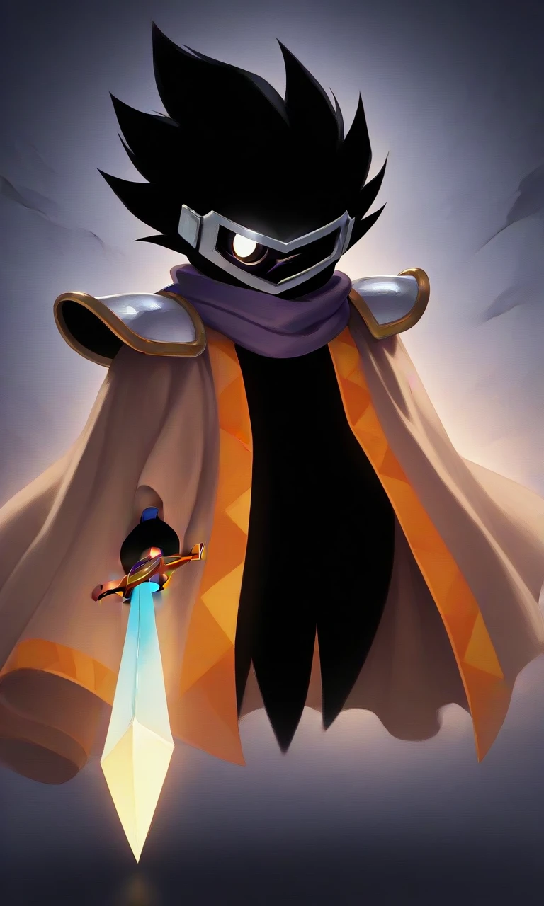Dark Swordsman, black skin, black hair, one eye, black pupil, silver visor, purple scarf, purple shoulder pads, brown cloak, orange outer lining, holding sword, no legs