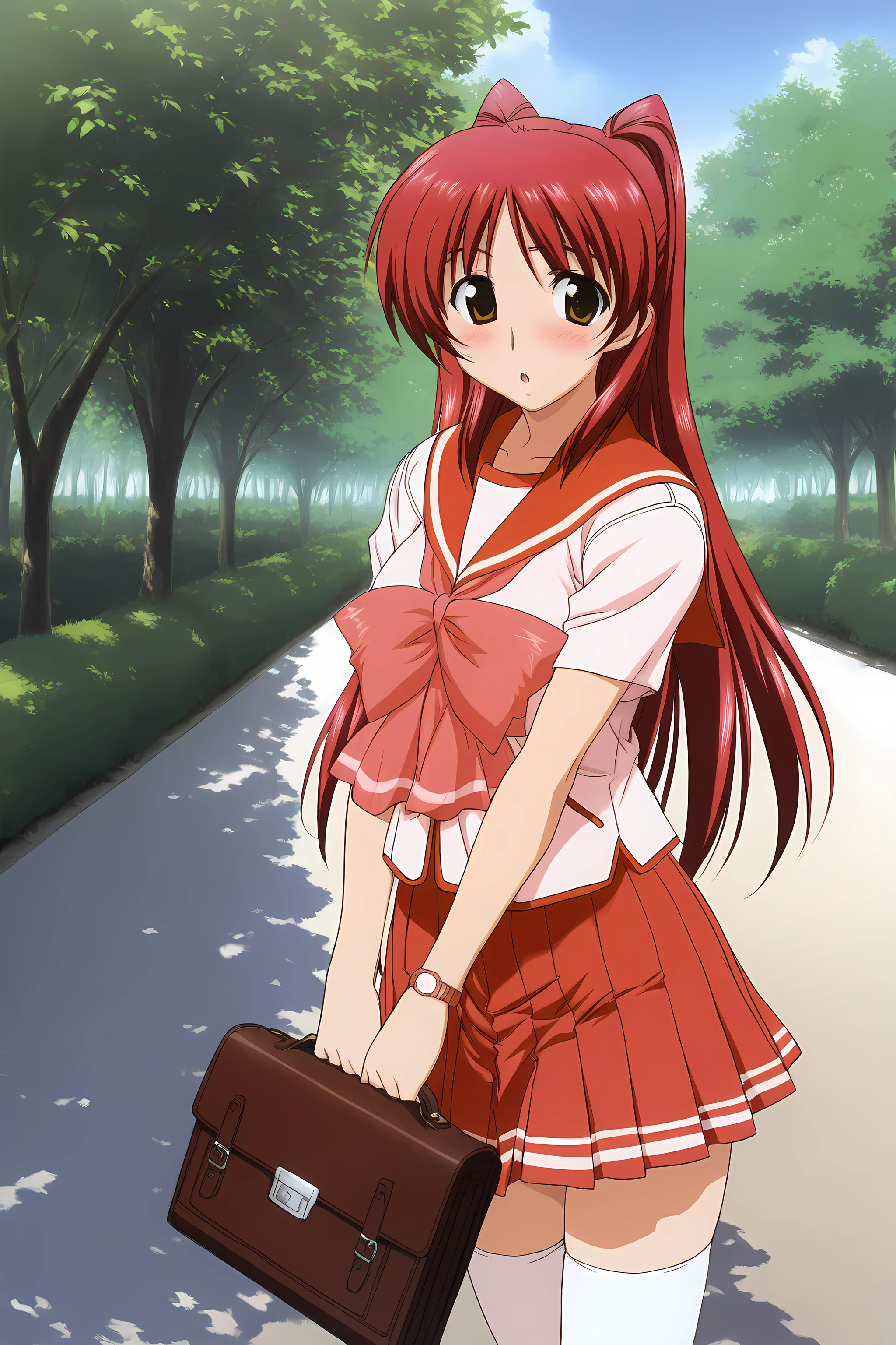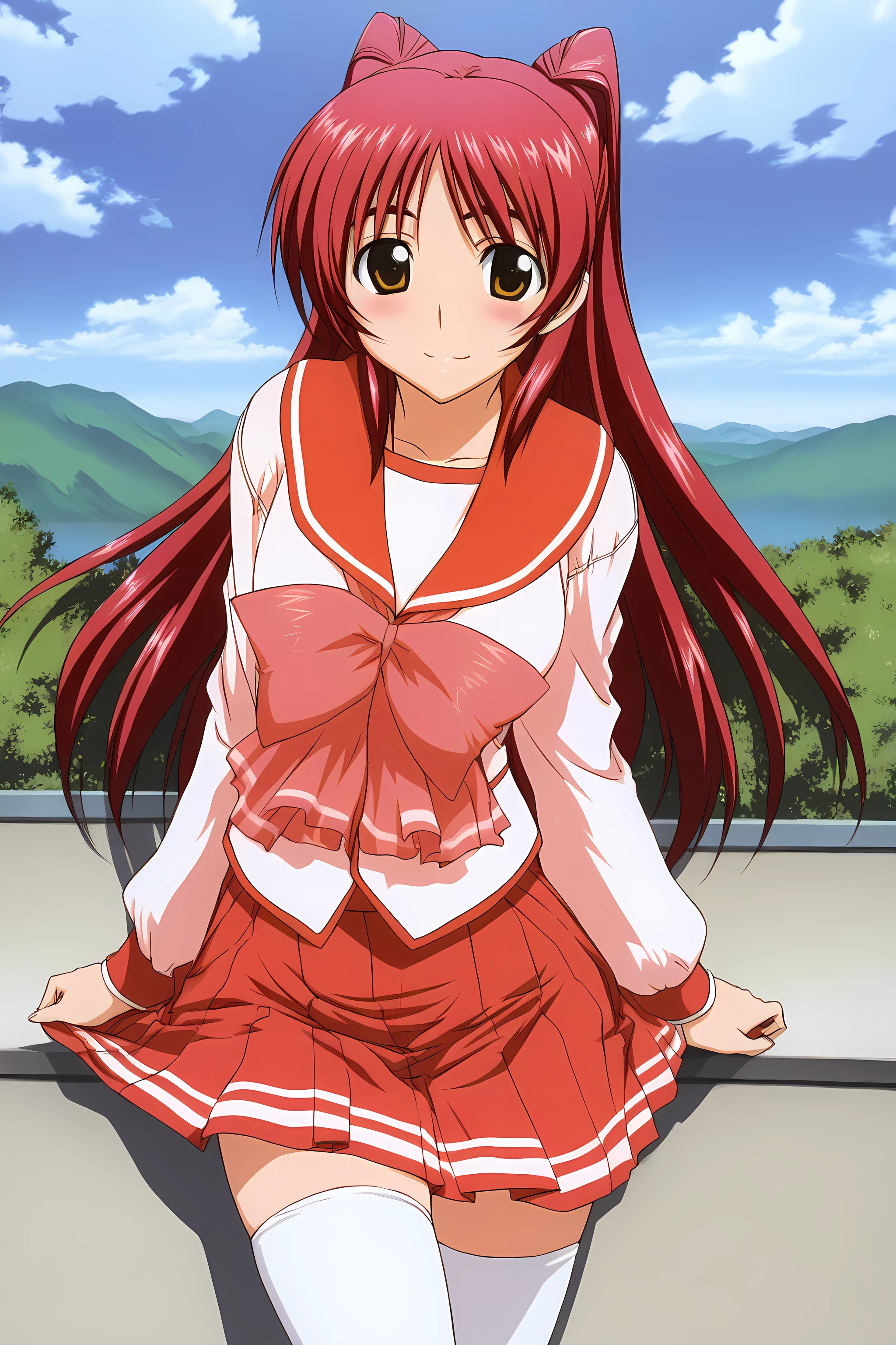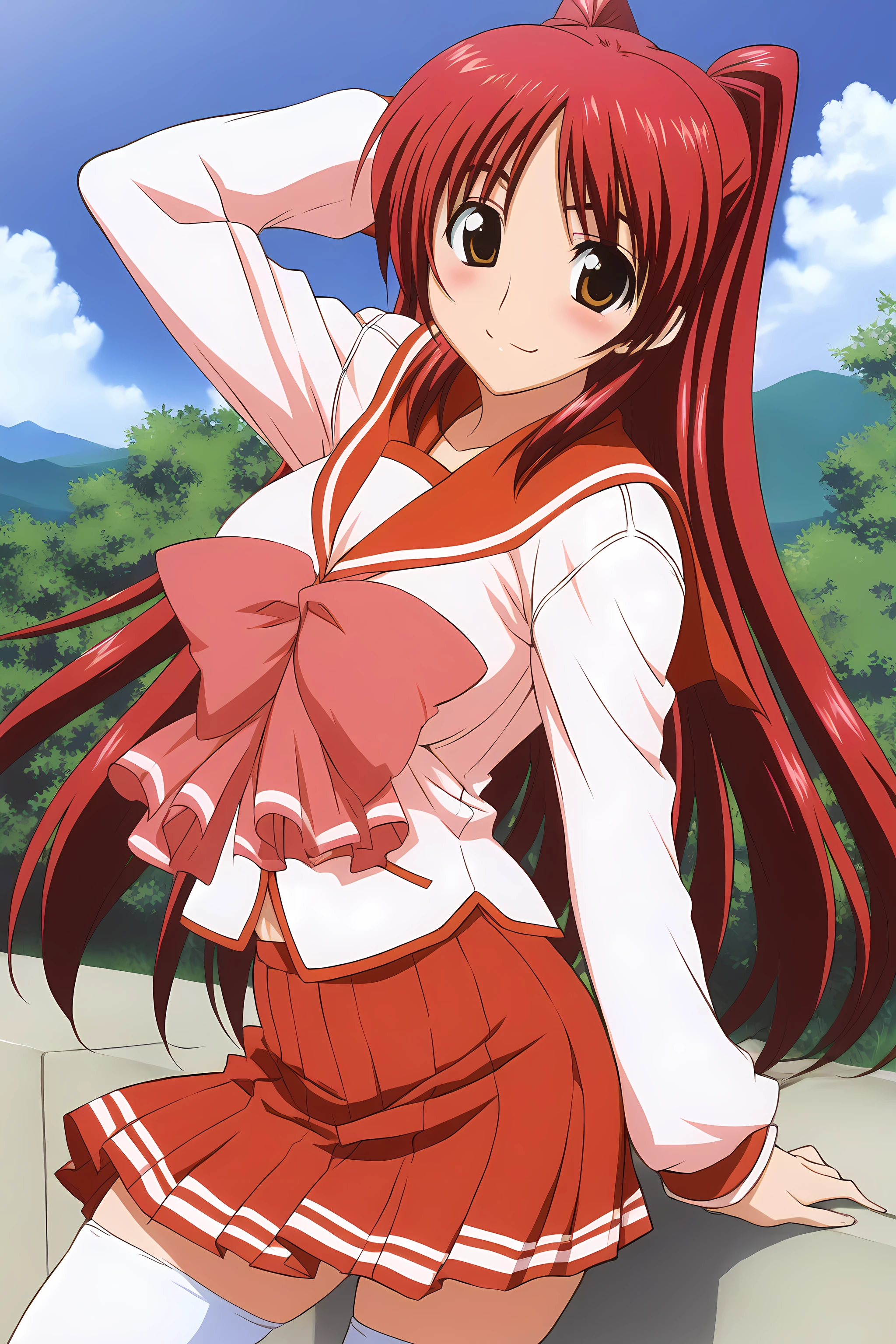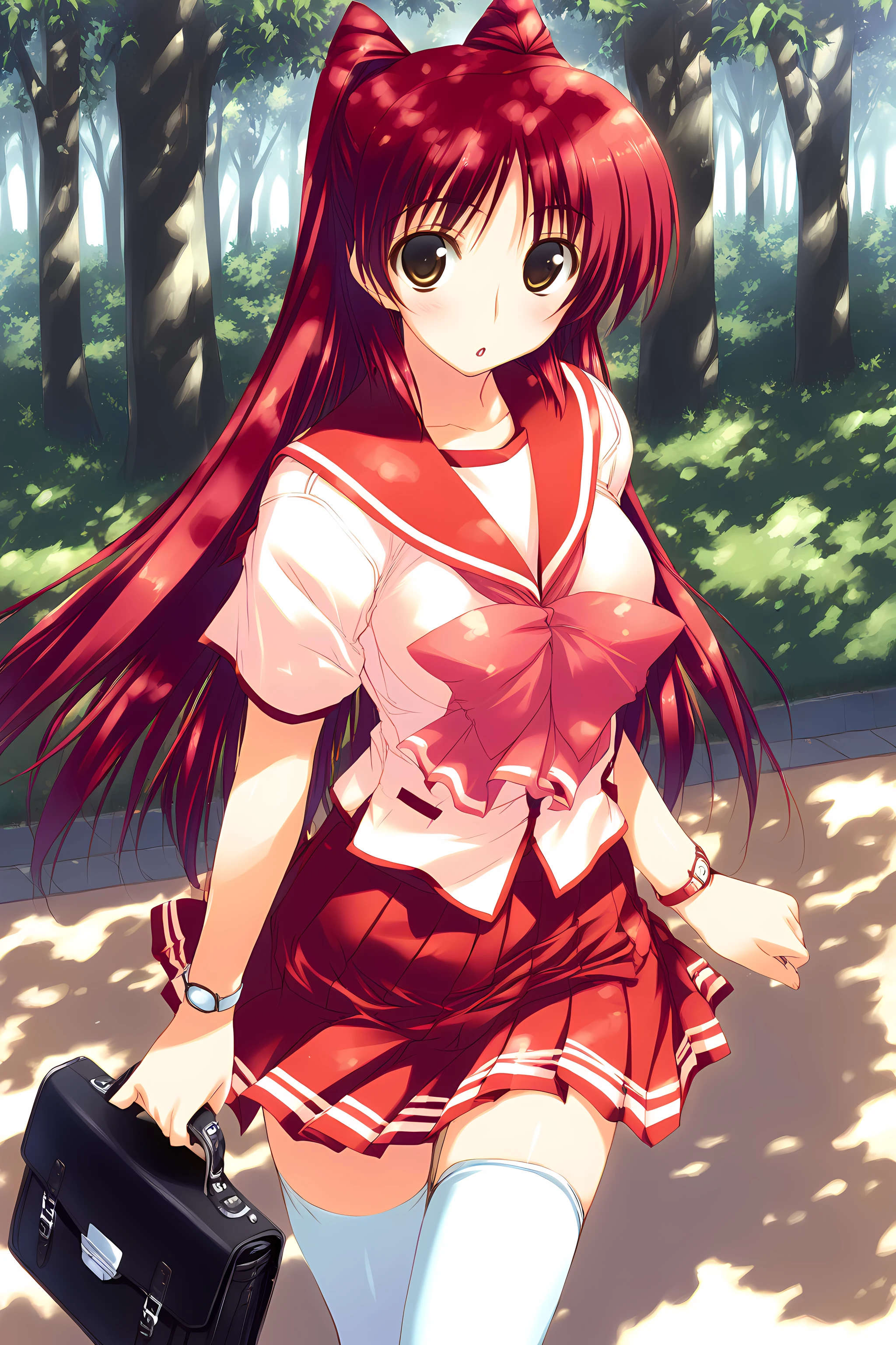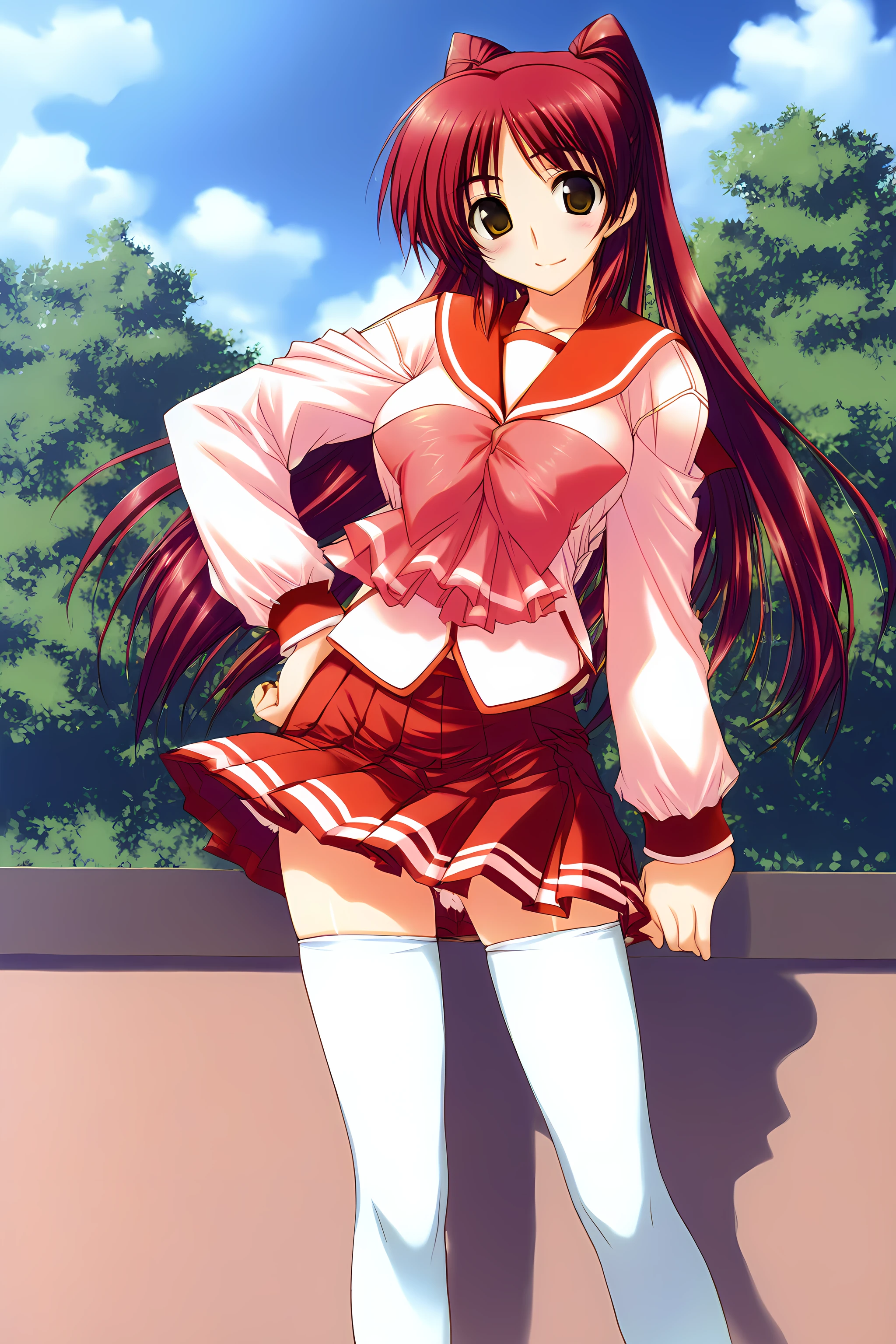 Outfit 1 is " defaultoutfit, thighhighs, school uniform, serafuku, skirt, large breasts, long sleeves, zettai ryouiki, pleated skirt, white thighhighs, miniskirt, red skirt, "