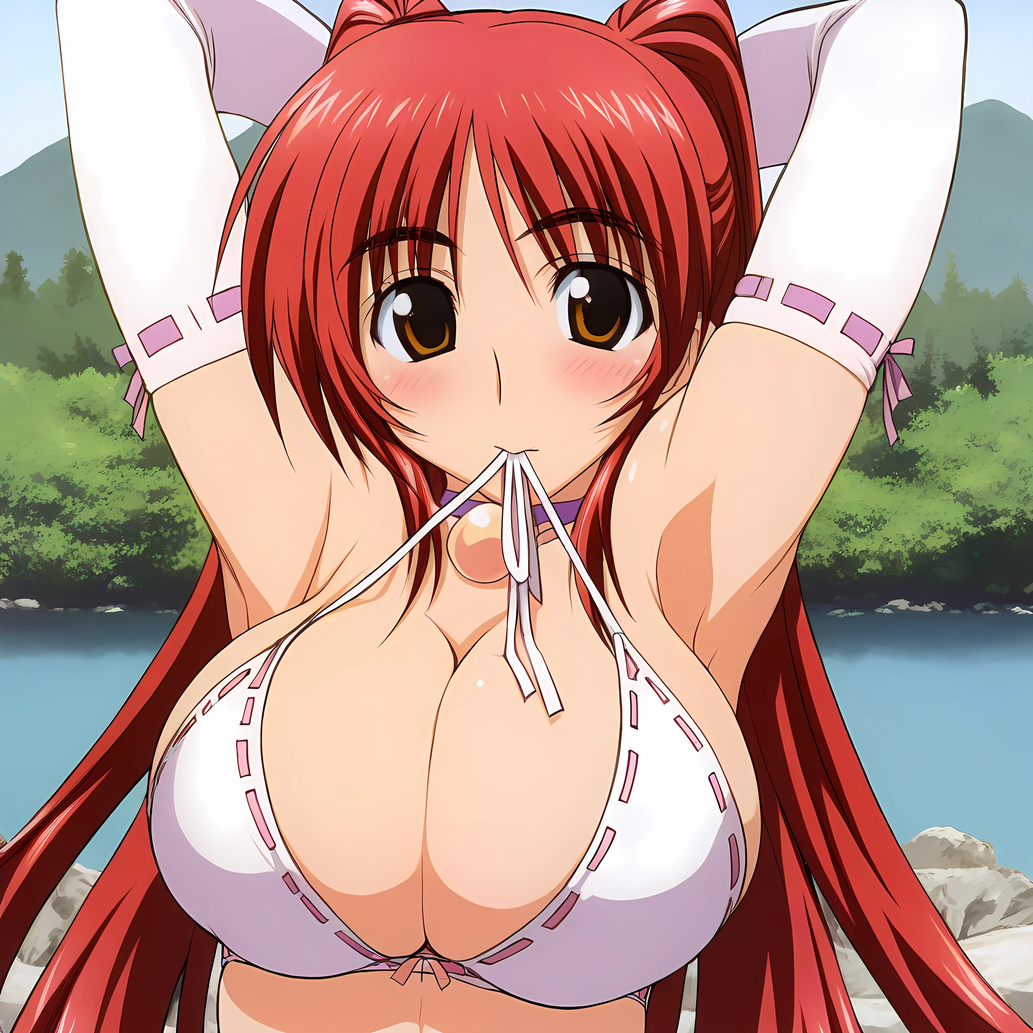 Outfit 2 is " defaultoutfit, gloves, elbow gloves, mouth hold, bikini, huge breasts, swimsuit, cleavage, white gloves, white bikini, ribbon, shiny skin, bikini top only, skindentation, ribbon trim, clothes in mouth, "