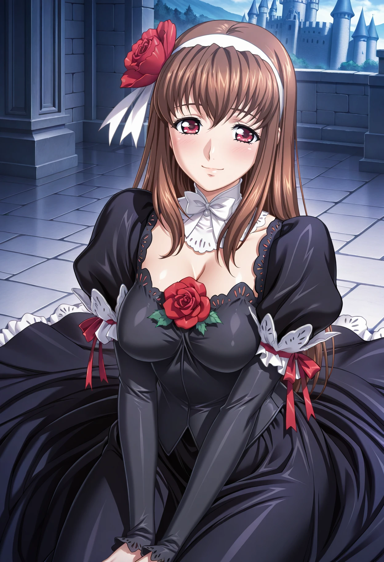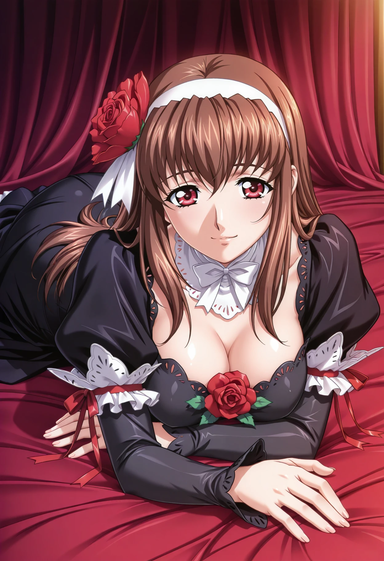 Base: kitamakiko, 1girl, solo, long hair, brown hair, hair flower, hairband, red eyes, raki2 dress, black dress ,white choker ,black dress, long sleeves, red rose, ribbon, breast cutout, large breasts,