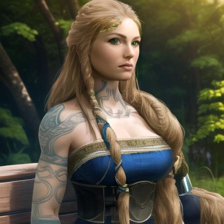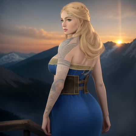 2. Does not have an activation tag but should be able to activate regardless with the right prompt, for this one: Long hair, braided hair, tattoo, shoulder tattoo, blue dress, strapless, blond hair, bare shoulders, green eyes,