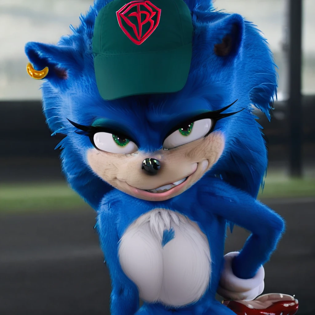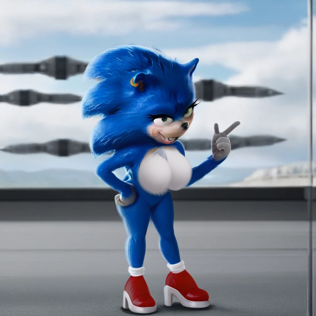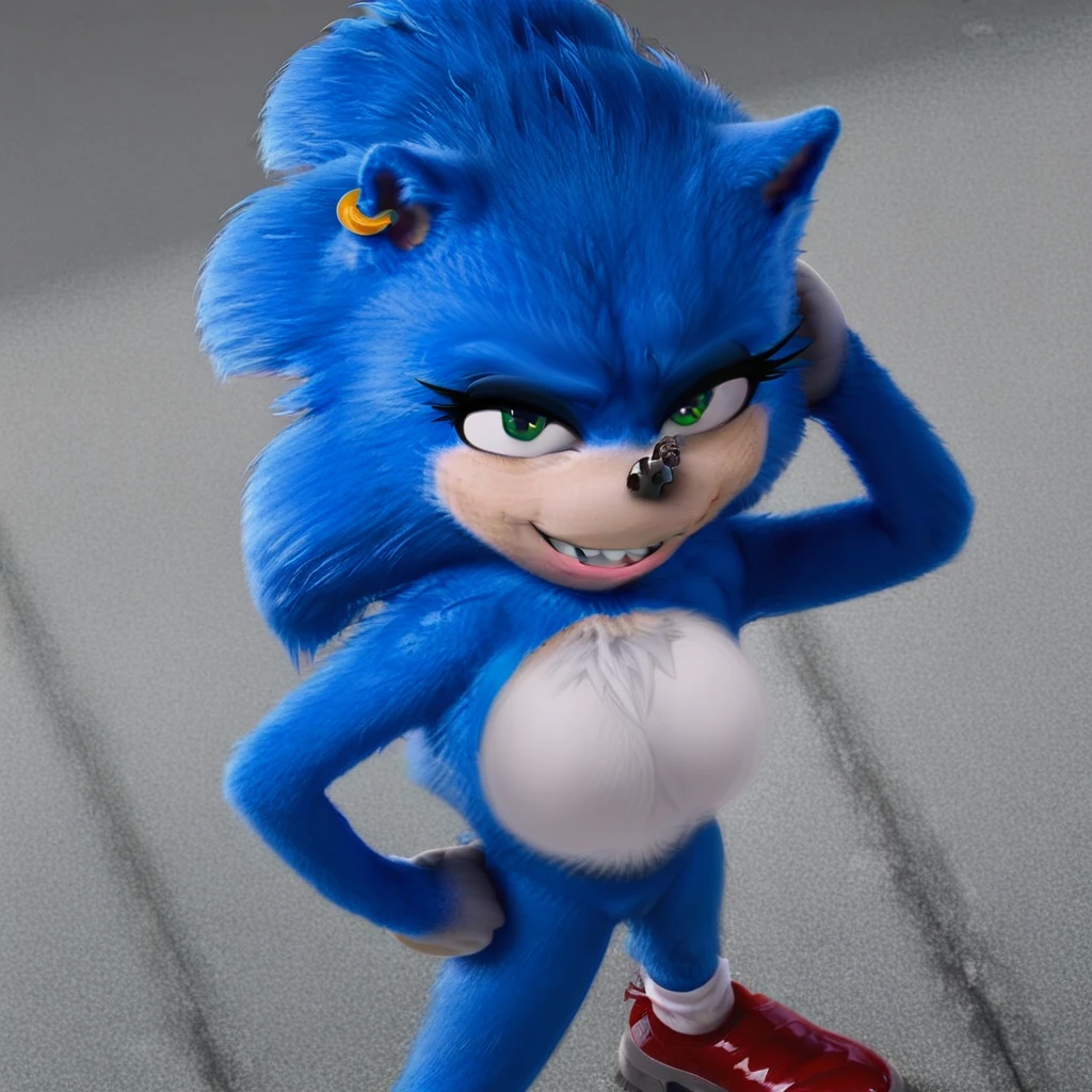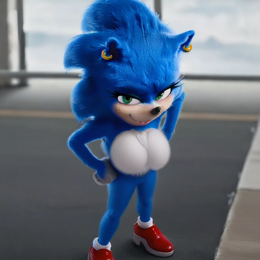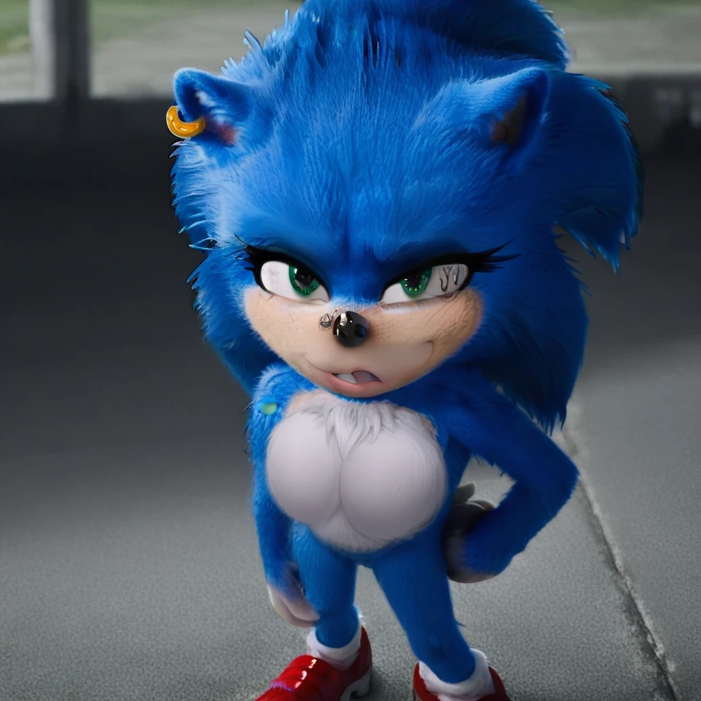 Sonic, female anthro, blue hedgehog, green eyes, eyeshadow, animal ears, earring, choker, white gloves, white socks, red shoes