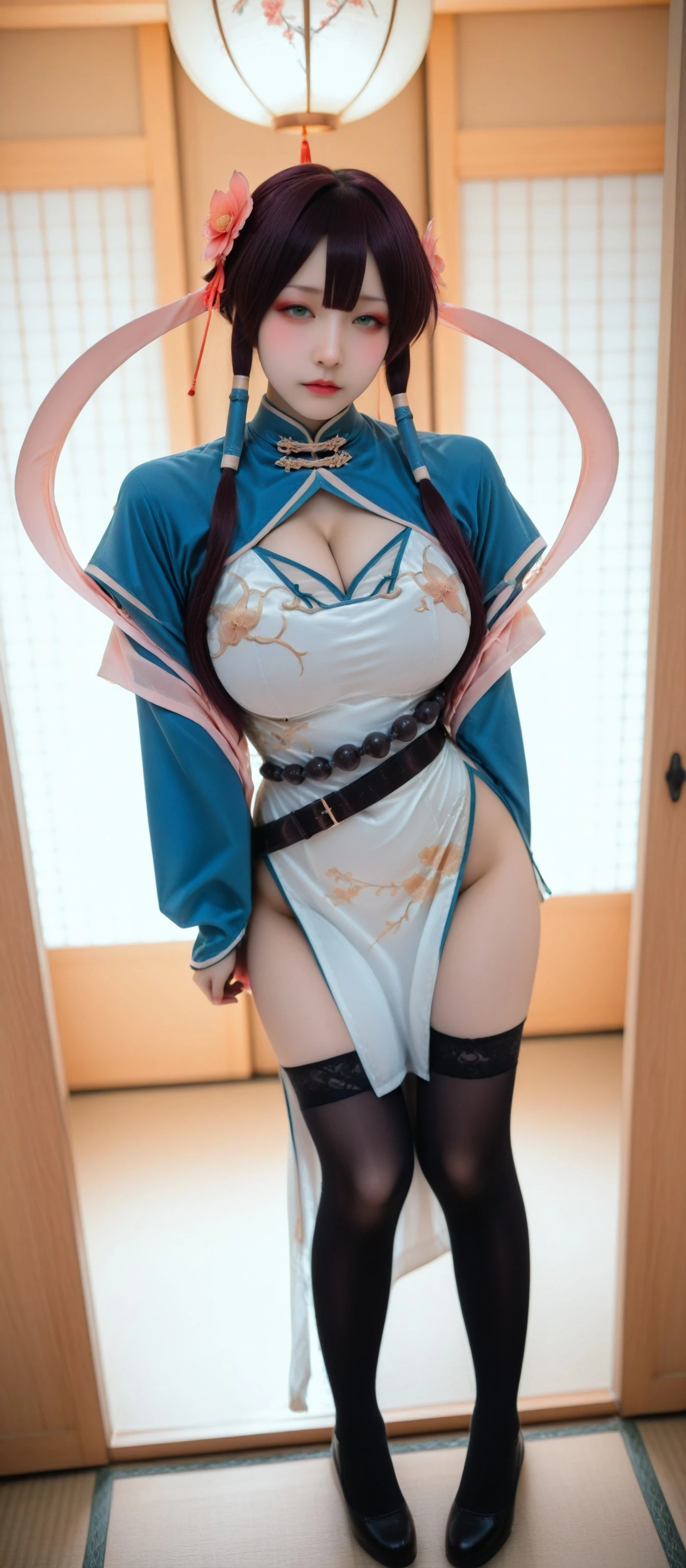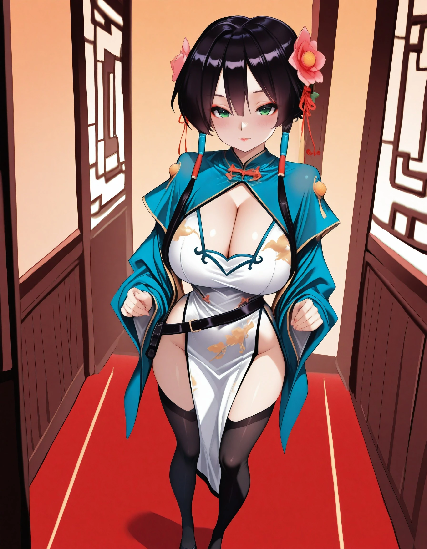 , luo_hao\(campione!\), clothing_cutout, cleavage_cutout, chinese_clothes, hair_flower, black_thighhighs, cleavage, large_breasts, pelvic_curtain, china_dress, white dress, green_eyes, long_sleeves, belt, dress, hair_ornament, thighhighs, shrug_(clothing), blue shrug, 1belt_buckle, belt, belt (clothing), long_hair, 1beads, shawl, hair_tubes,