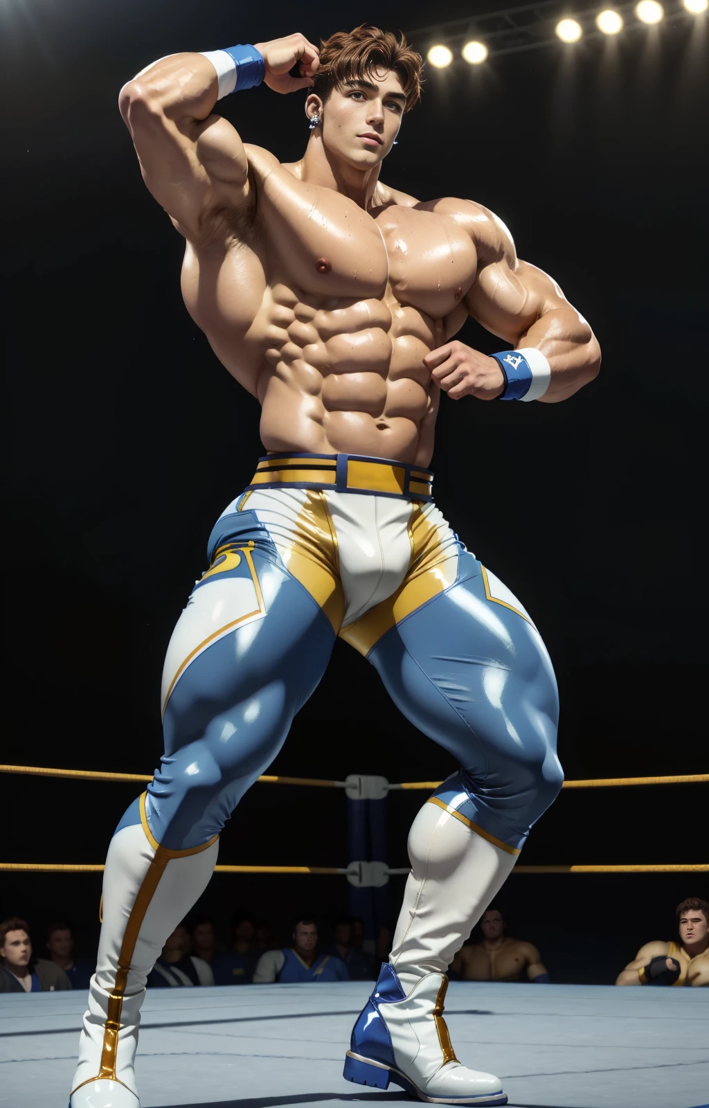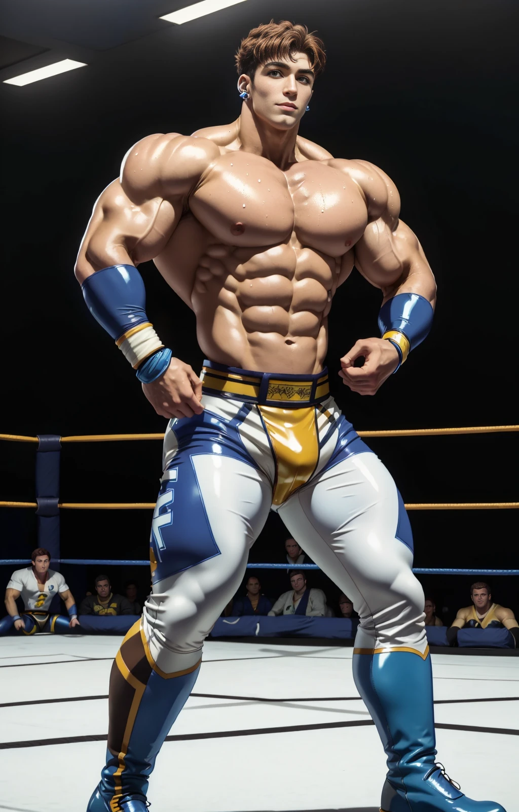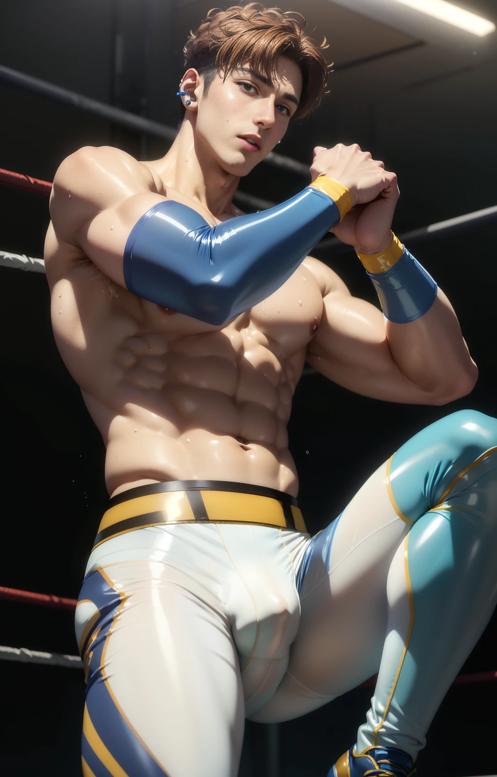 matakara asamine, earing, wrestler outfit, topless, abs, yellow and black belt, blue and white latex pants, blue and white boots, white crotch bulge,