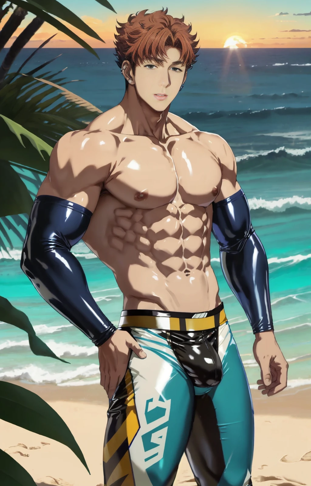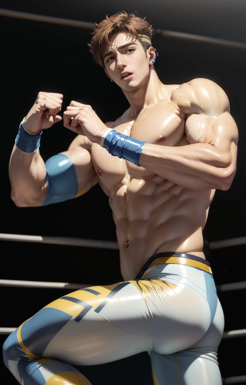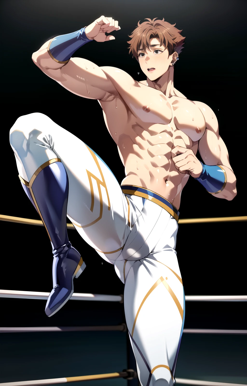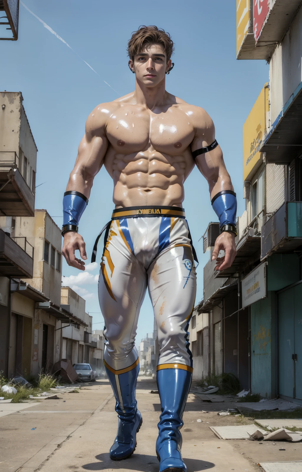 matakara asamine, earing, wrestler outfit, topless, abs, yellow and black belt, blue and white latex pants, blue and white boots, white crotch bulge,