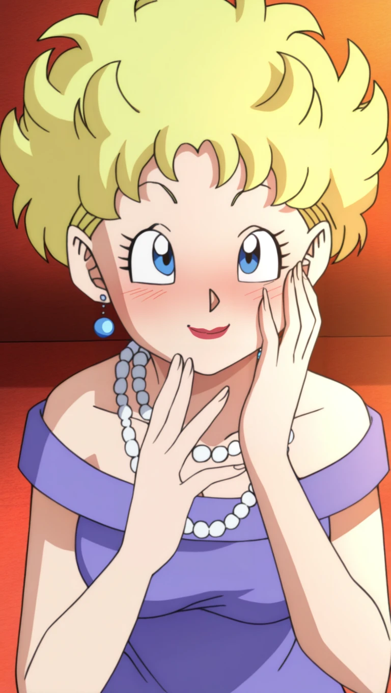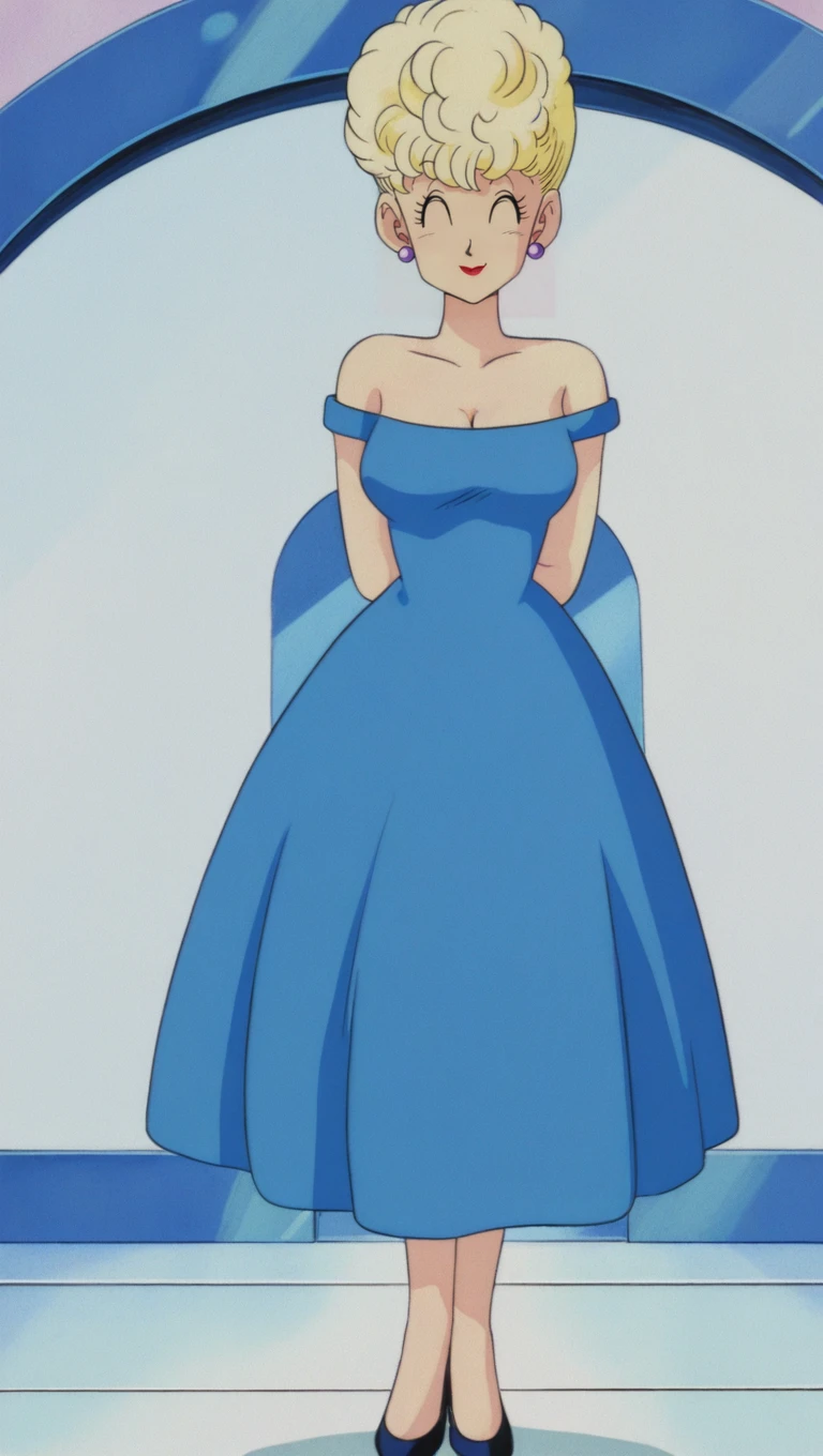 B0G outfit, curly hair, purple dress, blue earrings, pearl necklaces, light blue heels, dbs style, medium breasts,