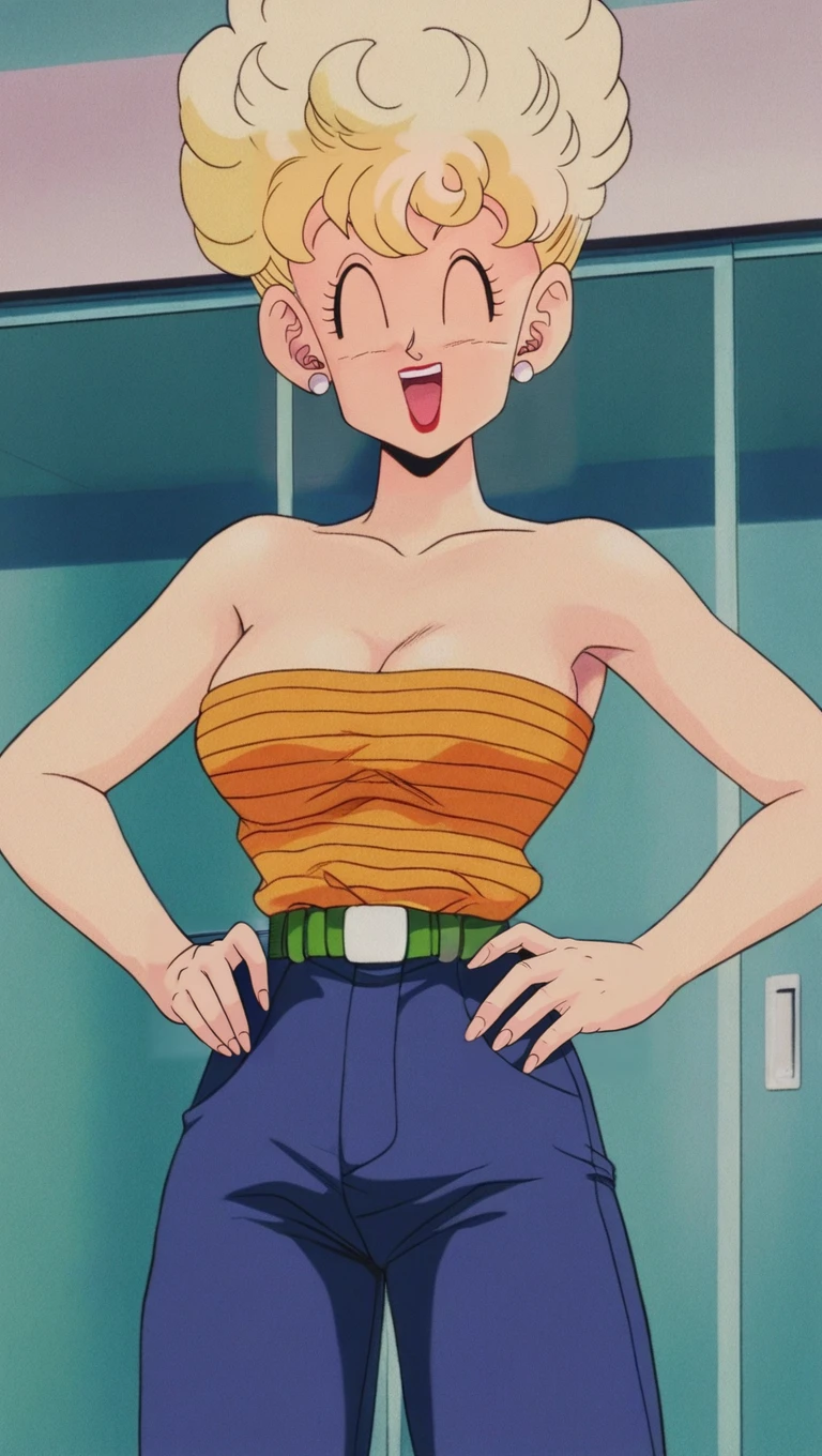 c4su4l outfit, afro, orange striped tube top, green belt, white sandals, blue jeans, white stud earrings, ??????????????, cleavage, Z style,