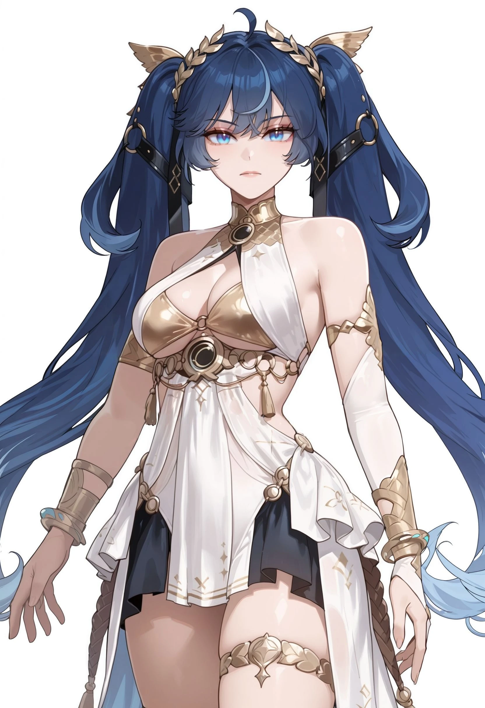 iuno wuthering waves, blue hair, blue eyes, medium breasts, streaked hair, multicolored hair, very long hair, twintails, hair belt, long hair, short dress, white dress, hair ornament, gold bra, bare shoulders, single bridal gauntlet, underboob, ancient greek clothes, greco-roman clothes, head wreath, showgirl skirt, white bridal gauntlets, thighlet, black skirt, <lora:wuthering_waves_iuno_illustrious:0.7>