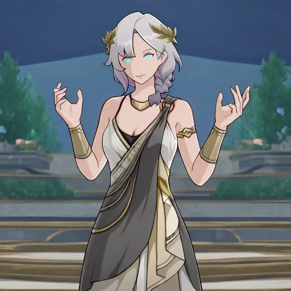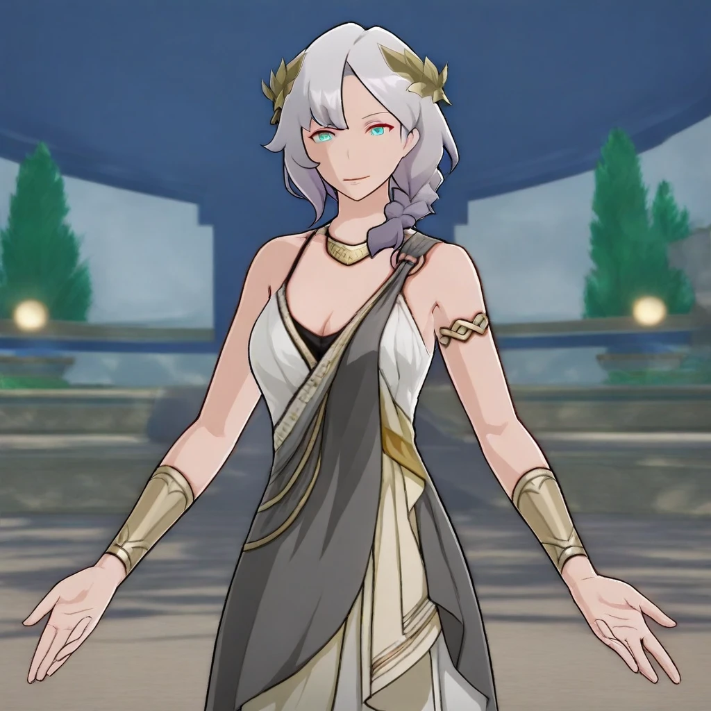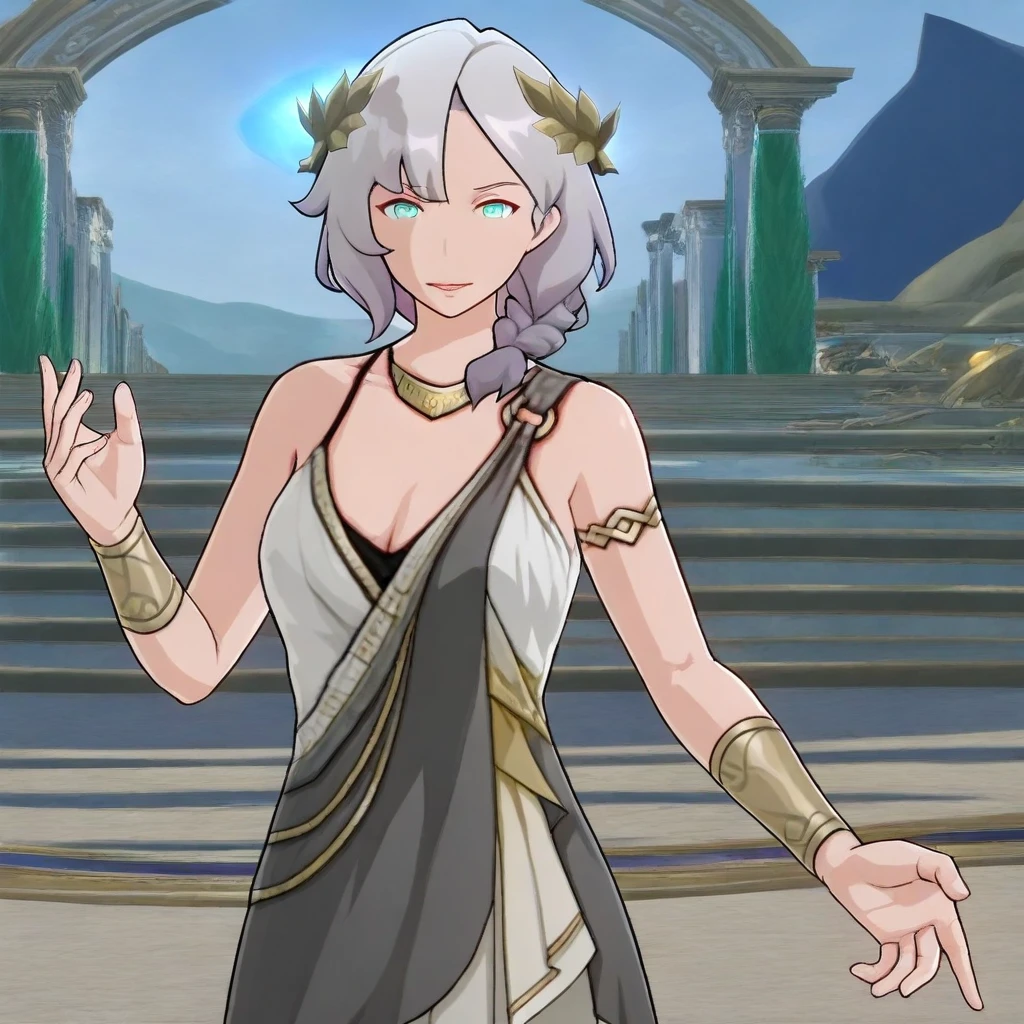 CaenisHSR, 1girl, solo, gray hair, short hair, bangs, braid, laurel crown, aqua eyes, lips, wrinkles, necklace, ancient greek clothes, large breast, cleavage, armlet, bracers, ancient greek dress, thick thighs, shoes, bare shoulders, white dress,