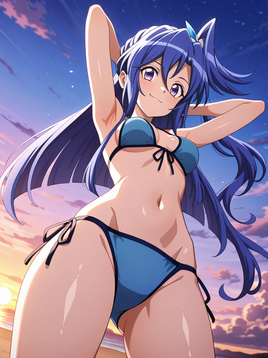 blue_hair purple eyes, one side up