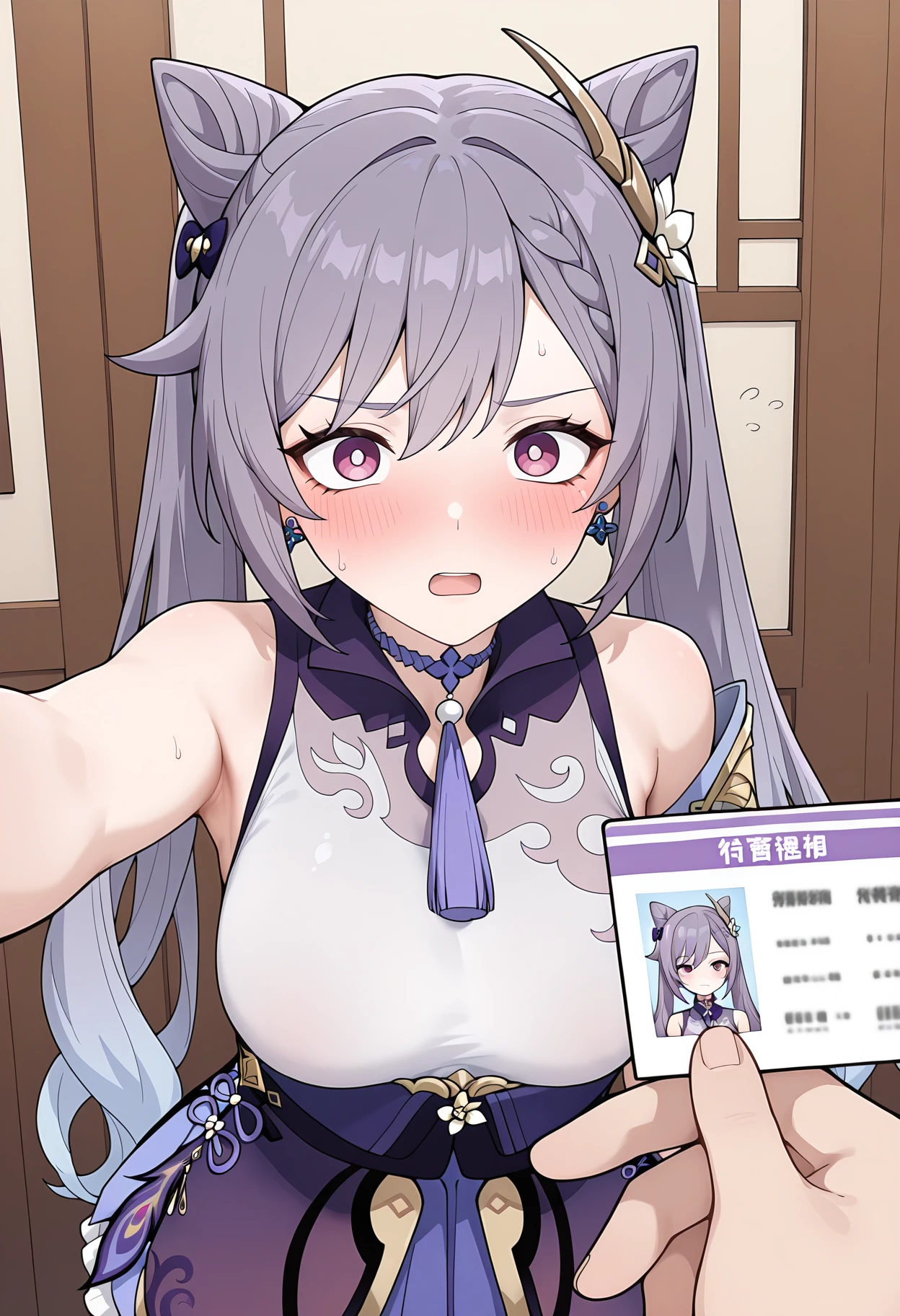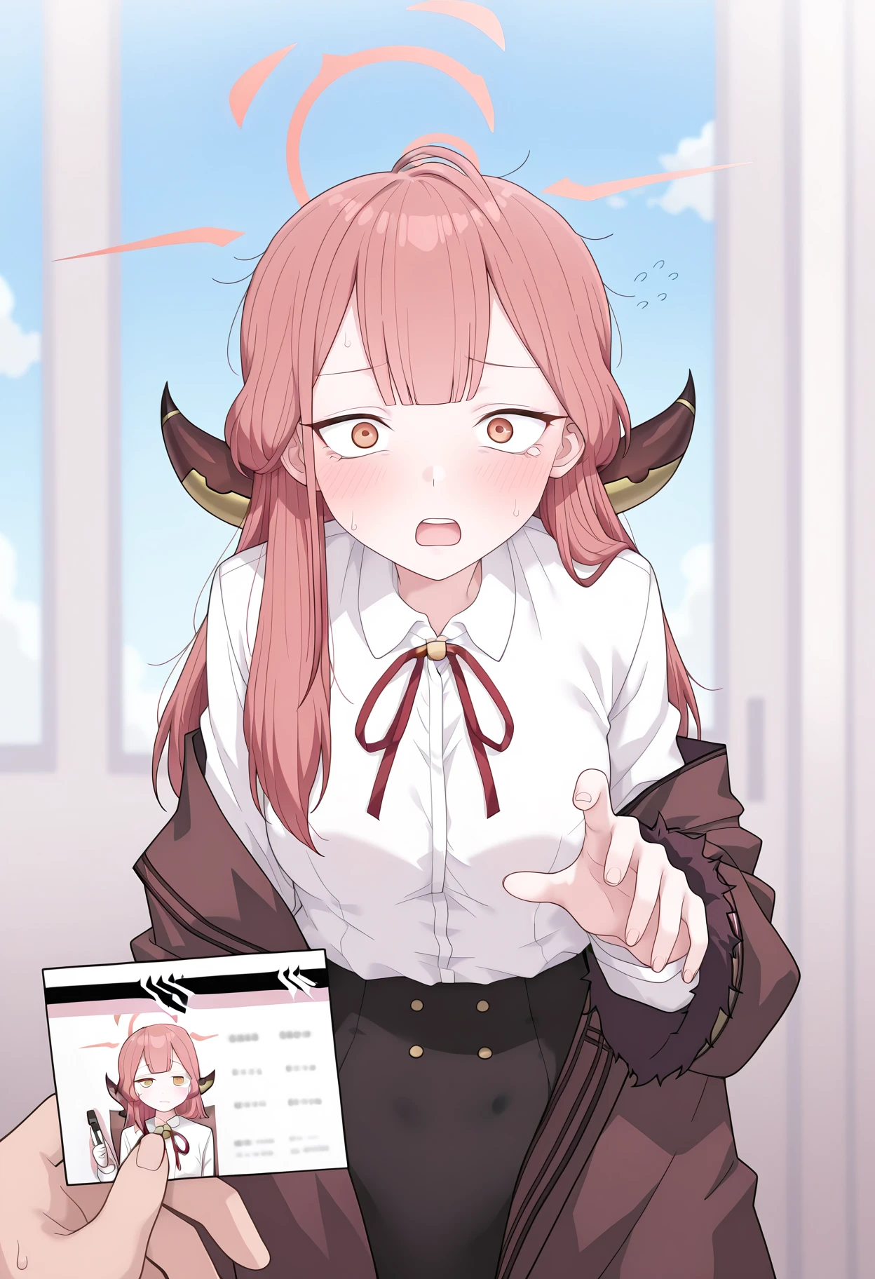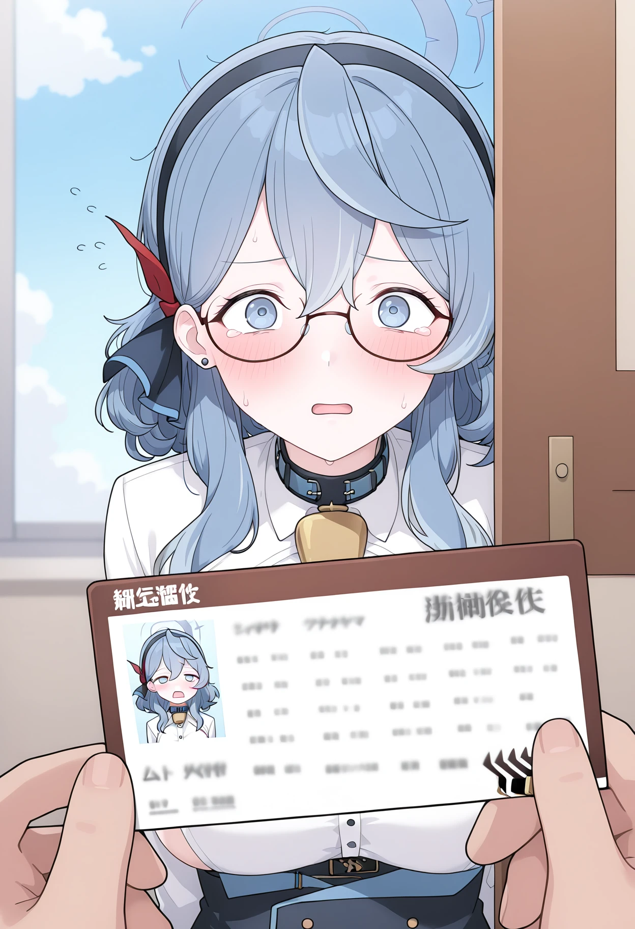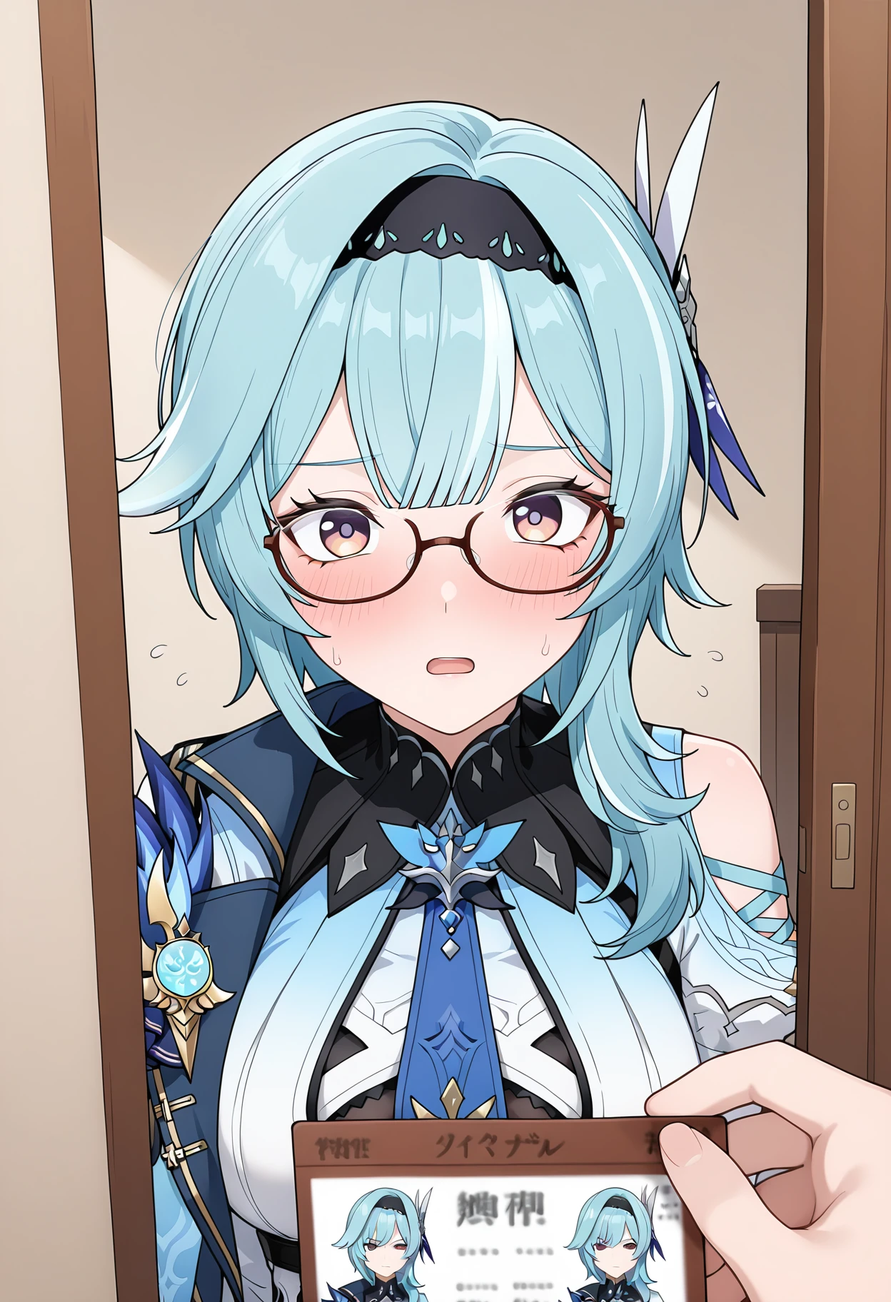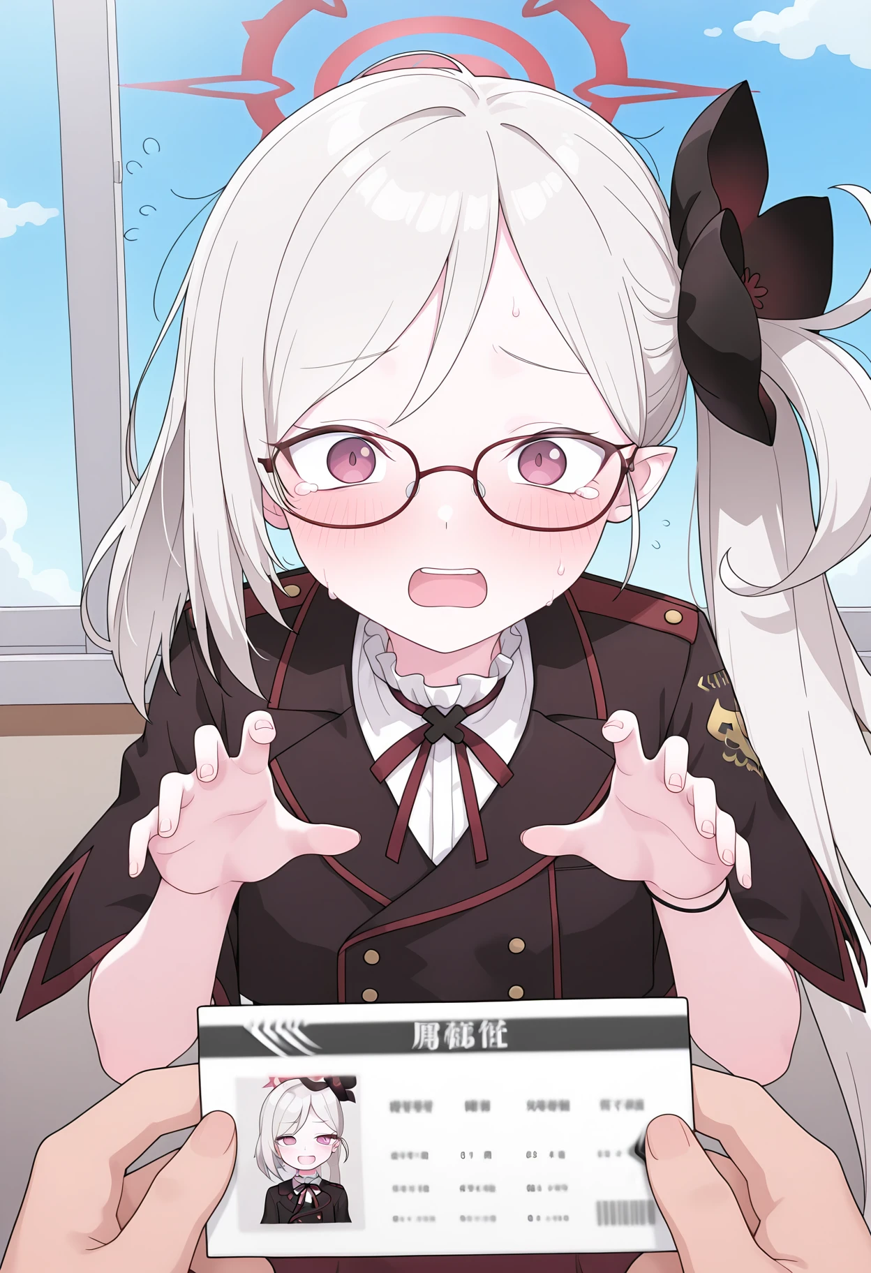shiarupastmeme, meme, holding, id card, pov hands, pov,solo focus, looking at viewer, blush, open mouth, flying sweatdrops,