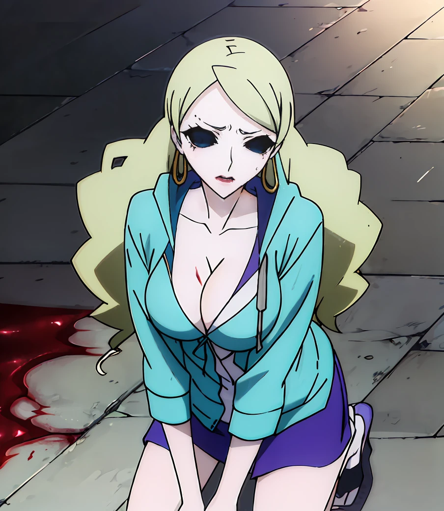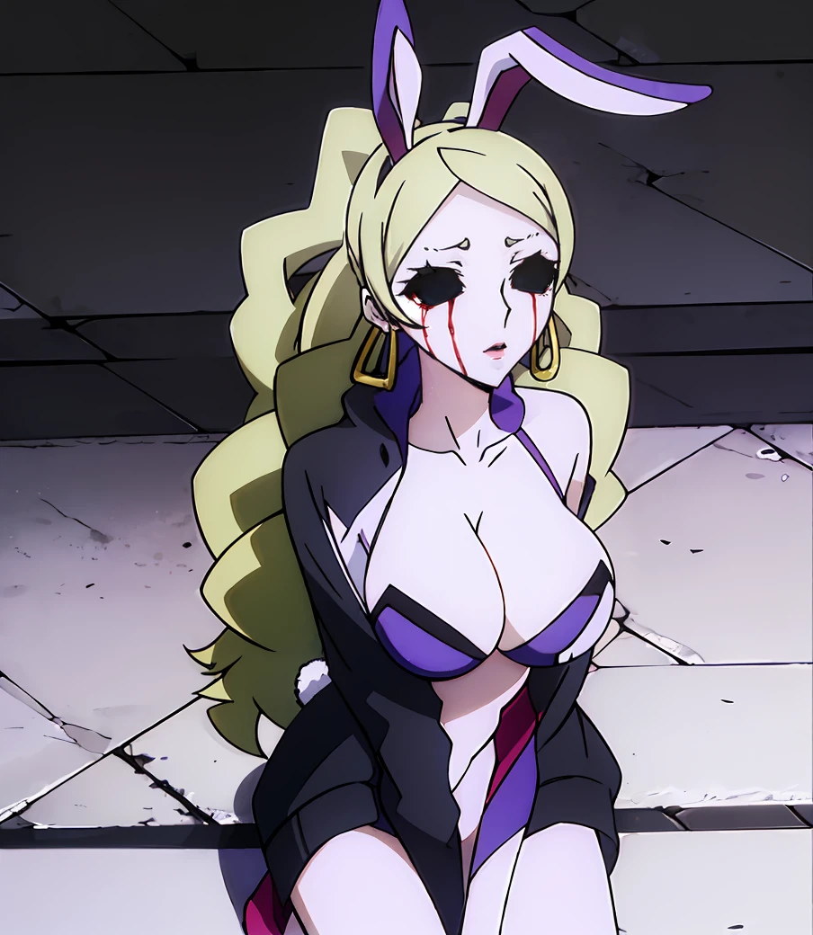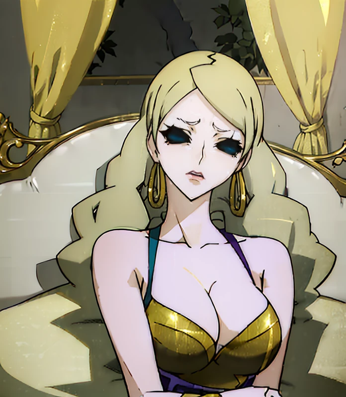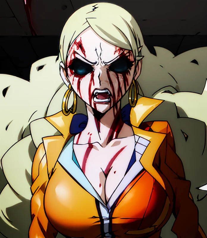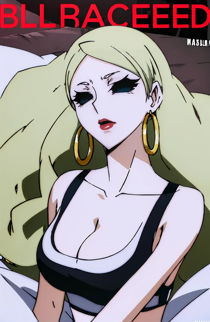 long hair, blonde hair, cleavage, makeup, lipstick, black sclera, empty eyes, no pupils, hoop earrings, pale skin
