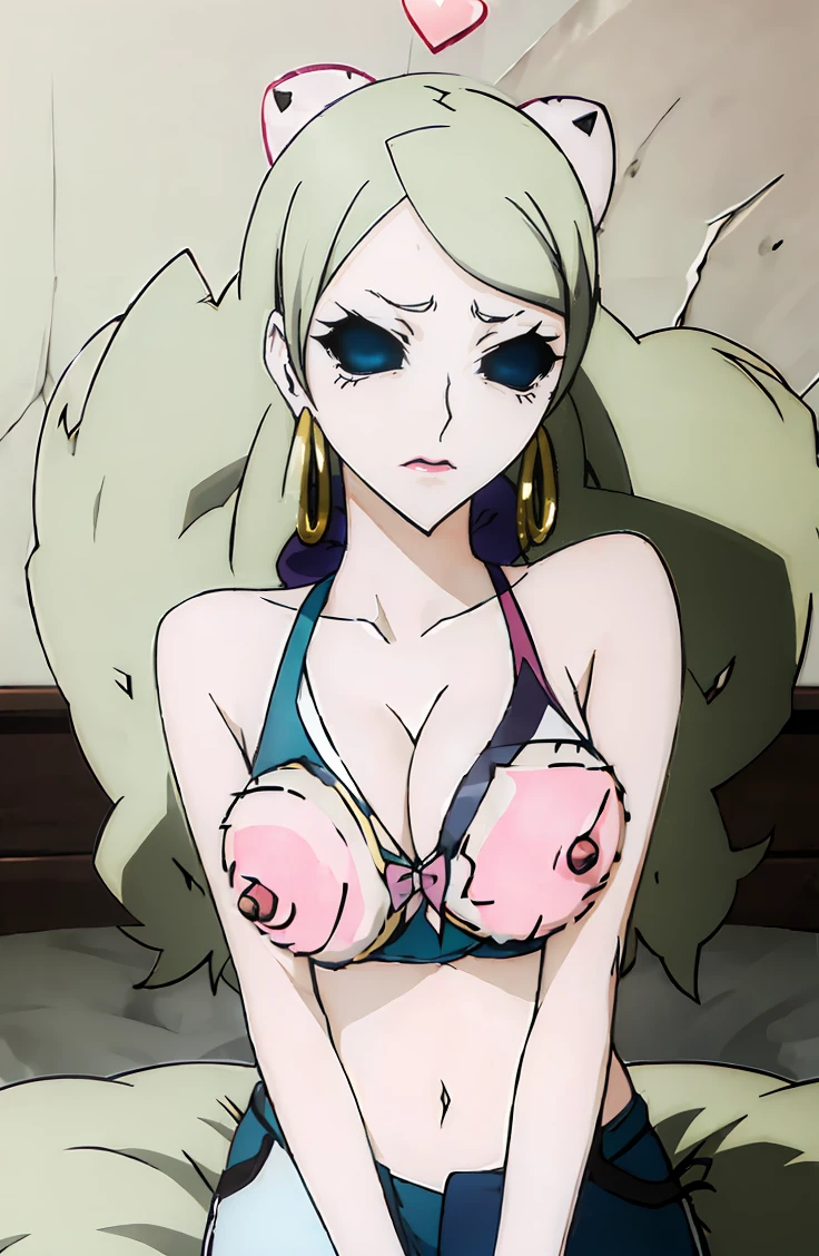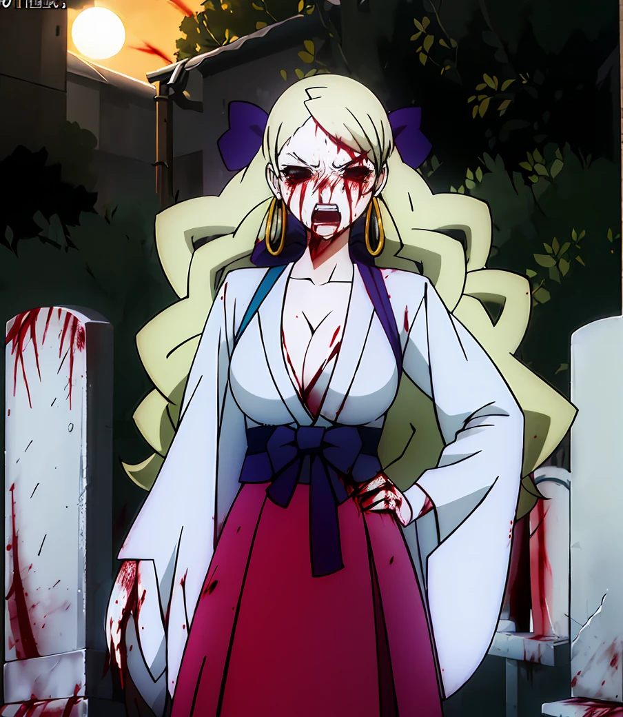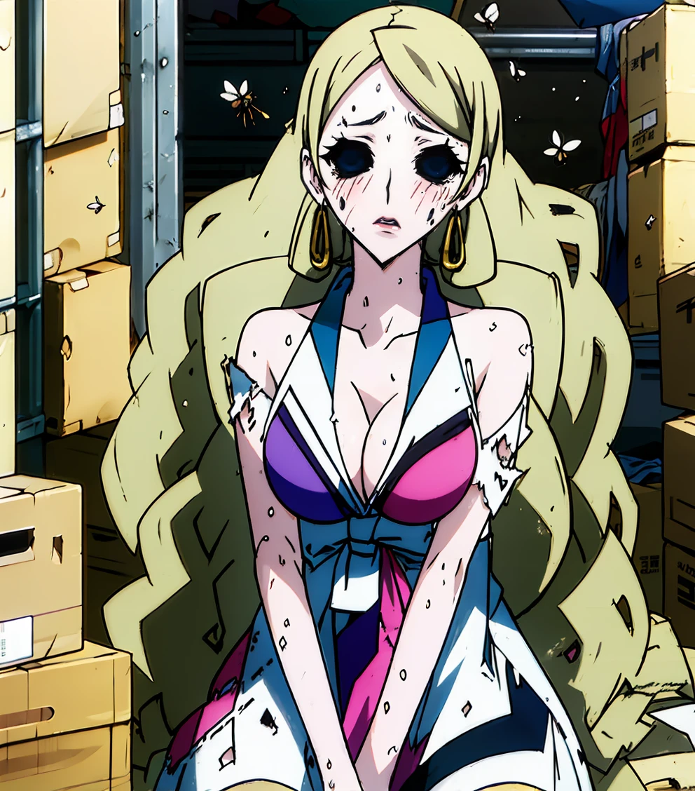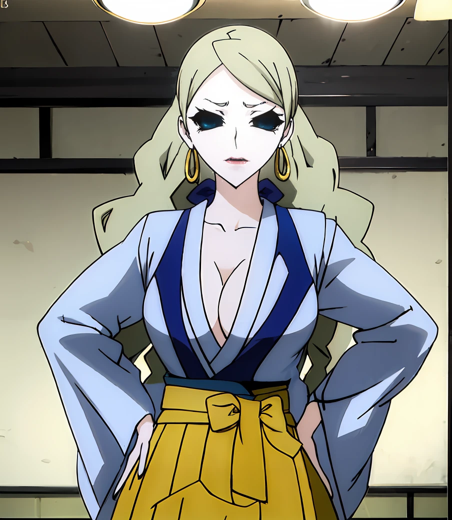 long hair, blonde hair, cleavage, makeup, lipstick, black sclera, empty eyes, no pupils, hoop earrings, pale skin