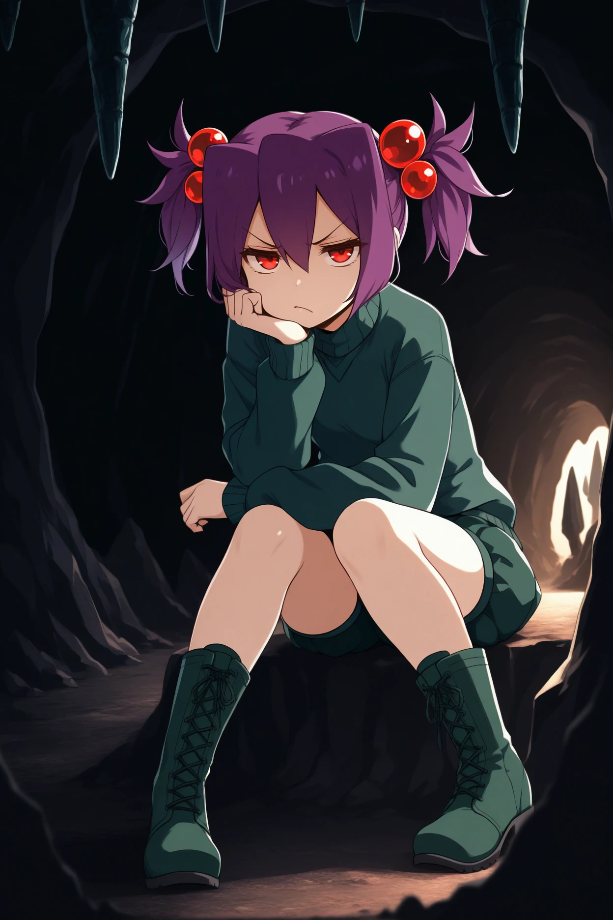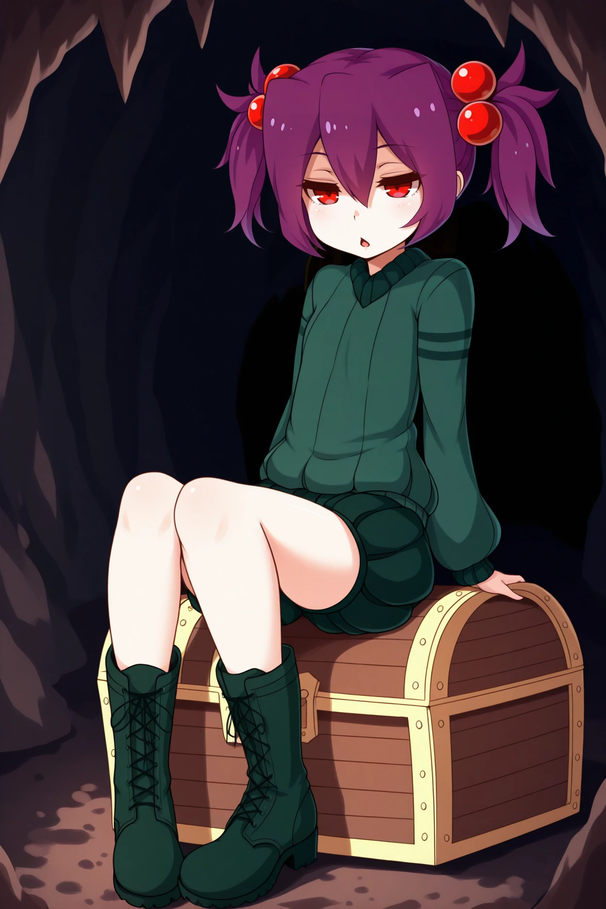 Add "green sweater, green shorts, short shorts, green boots, lace-up boots" for her typical look.