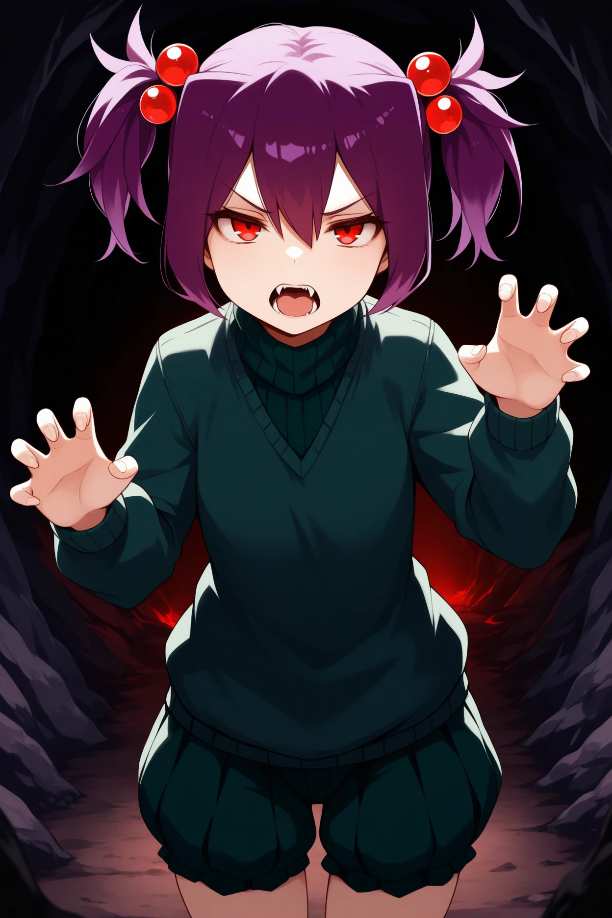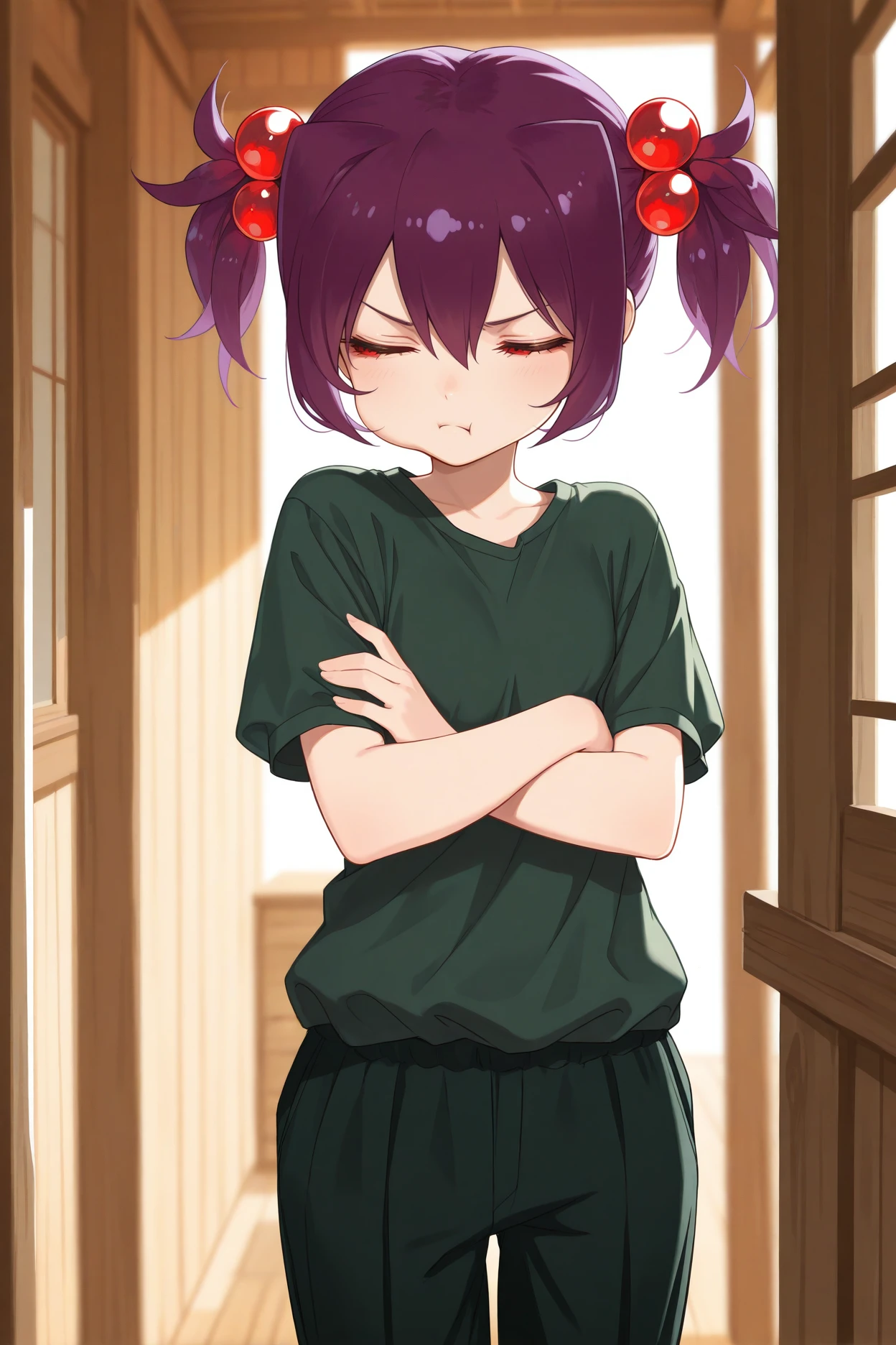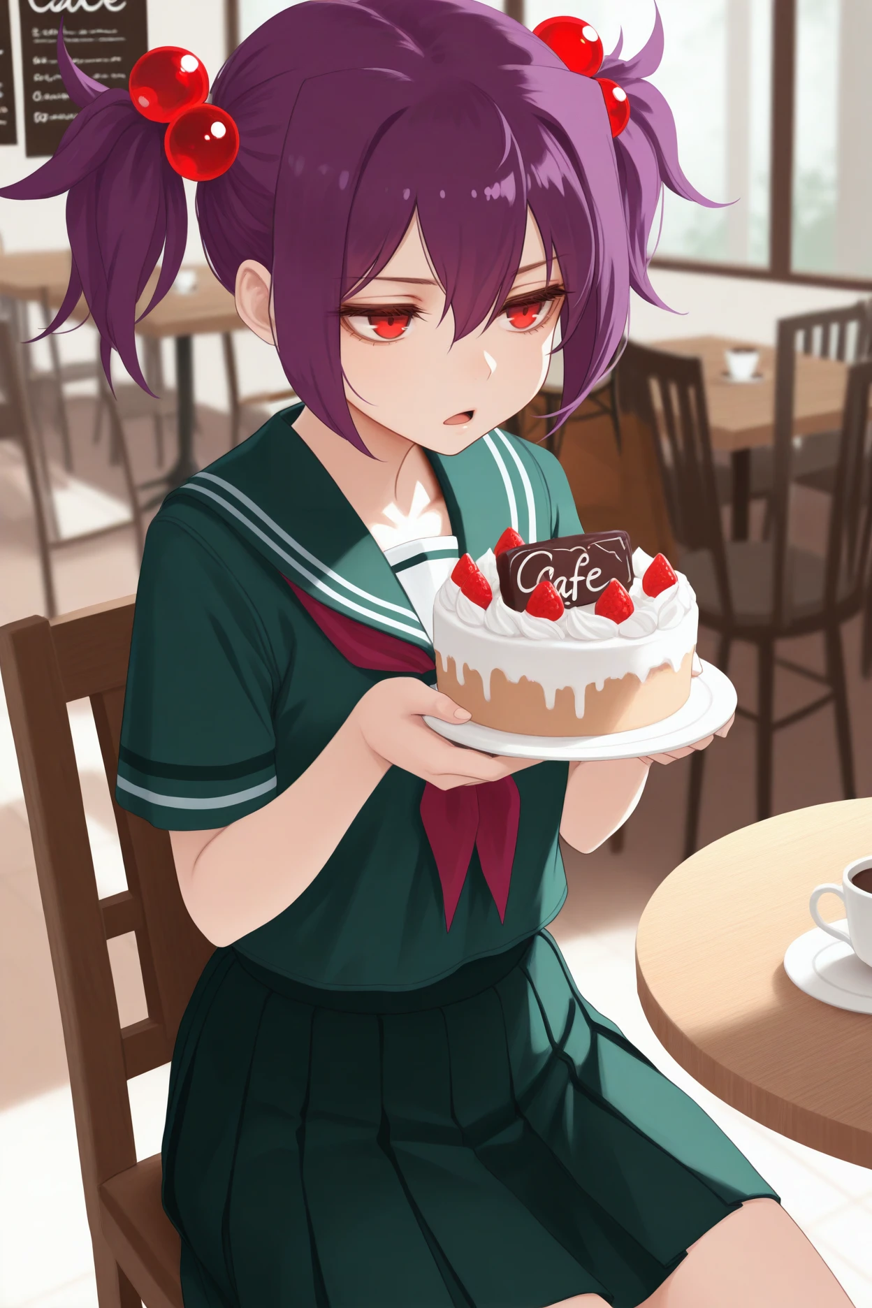 mtcs, purple hair, short twintails, red eyes, hair bobbles