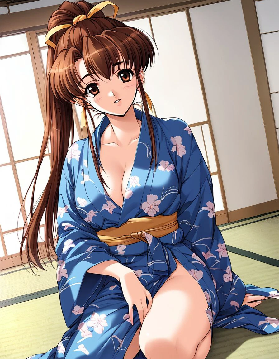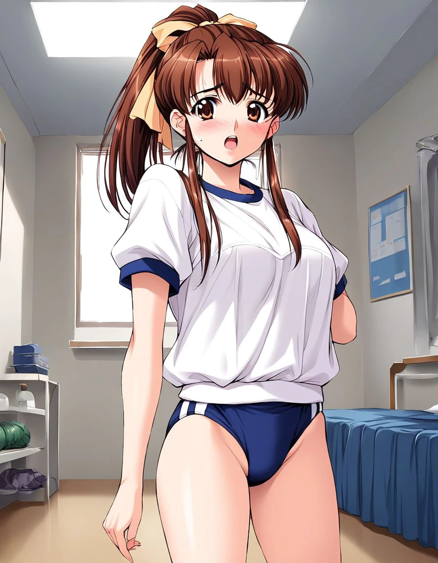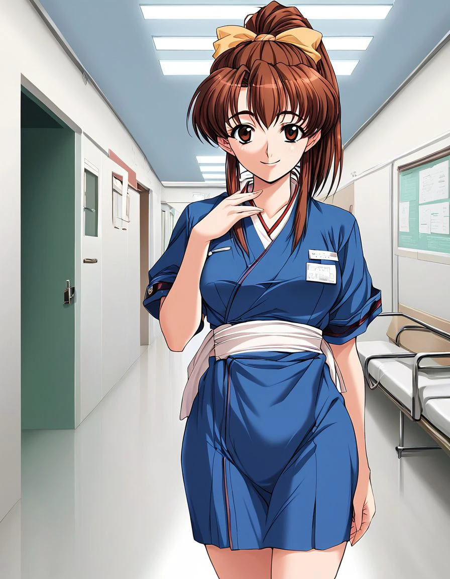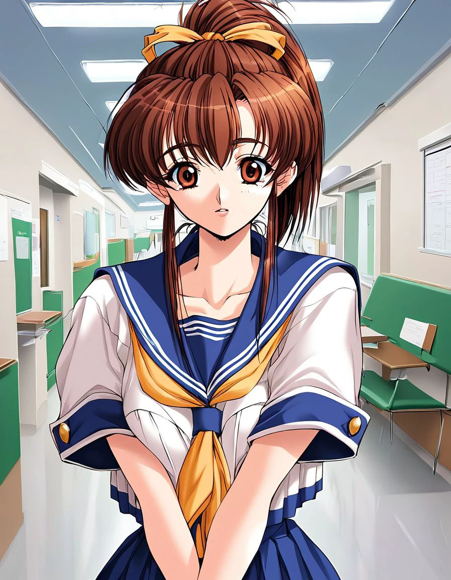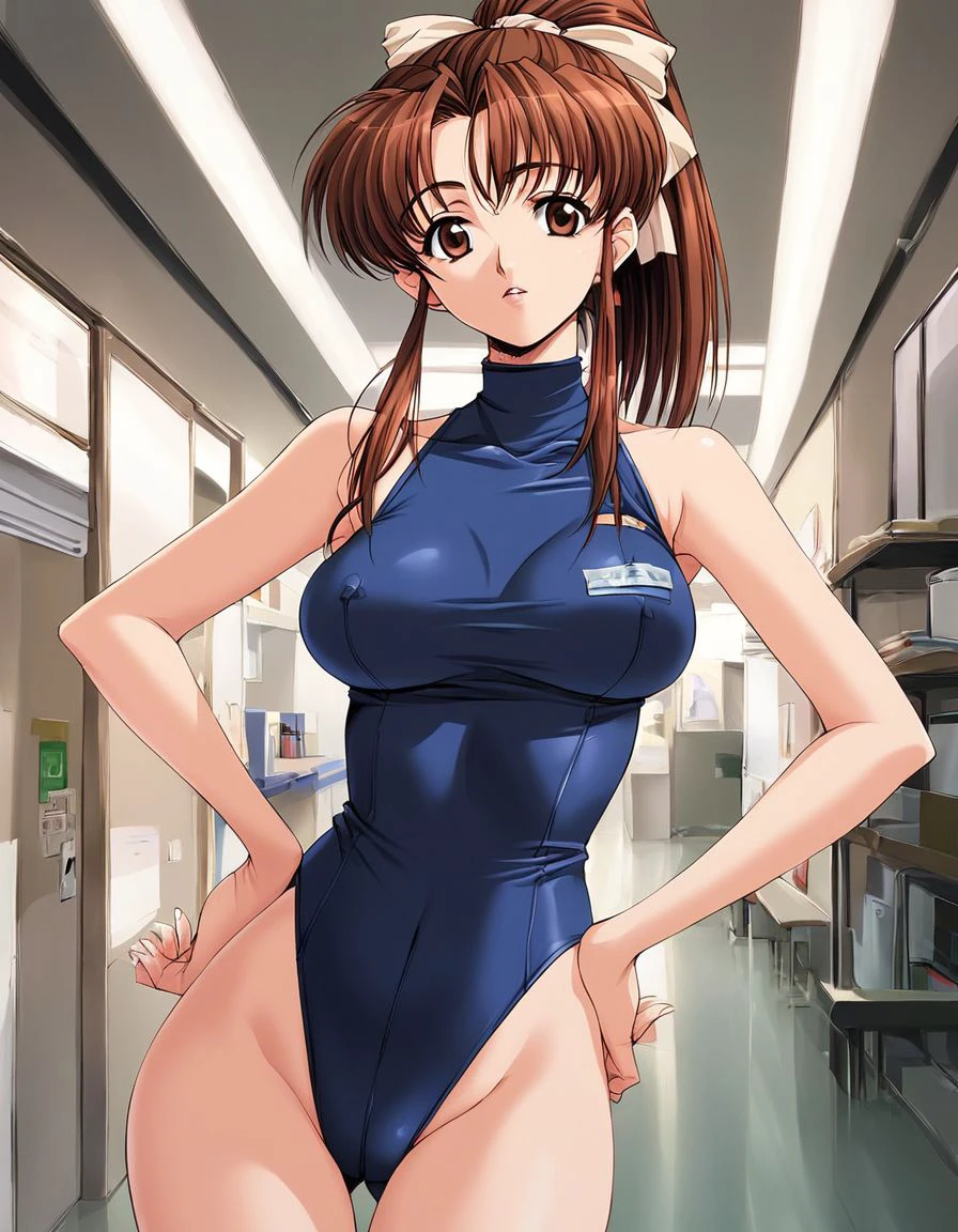Shimagi_Kana(Nonomura_Hospital_PC98), 1girl, solo, brown hair, brown eyes, hair ribbon, high ponytail, breasts,
