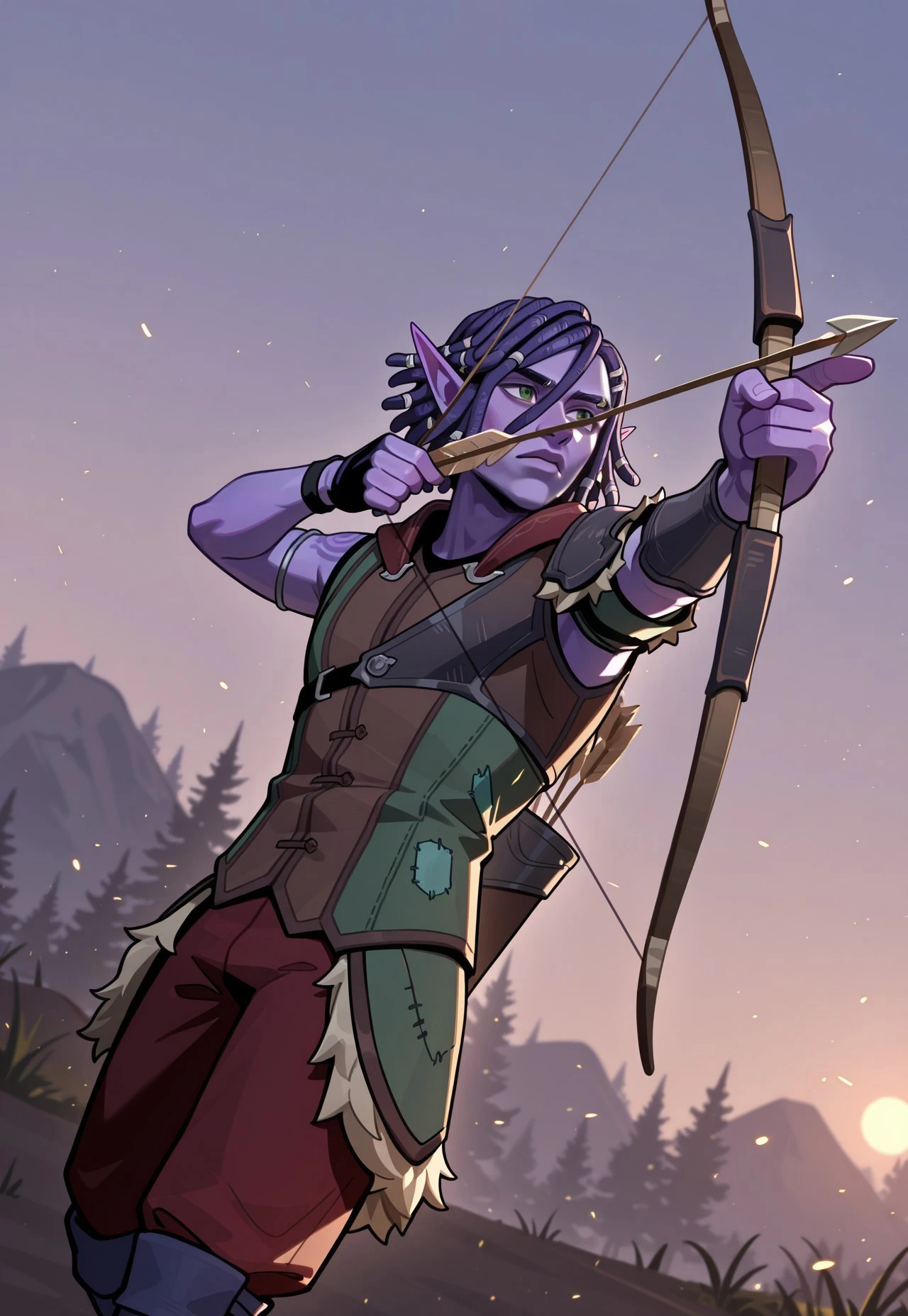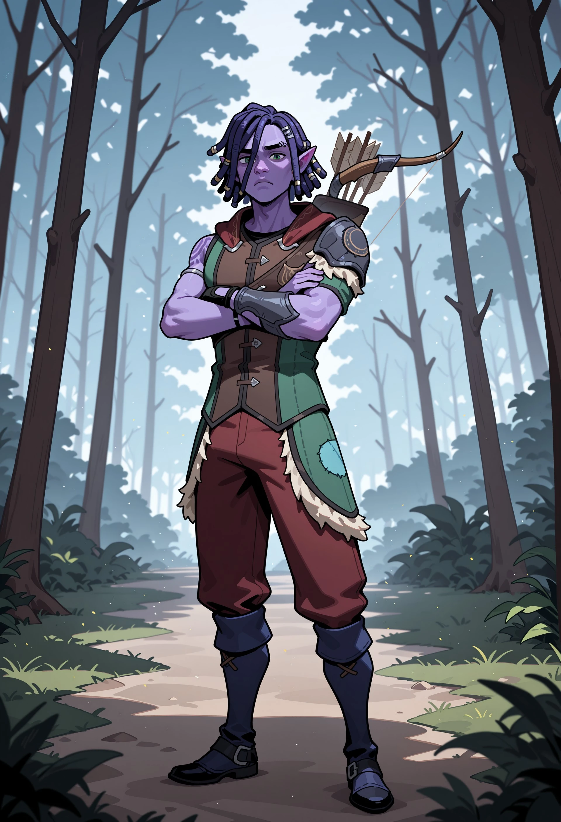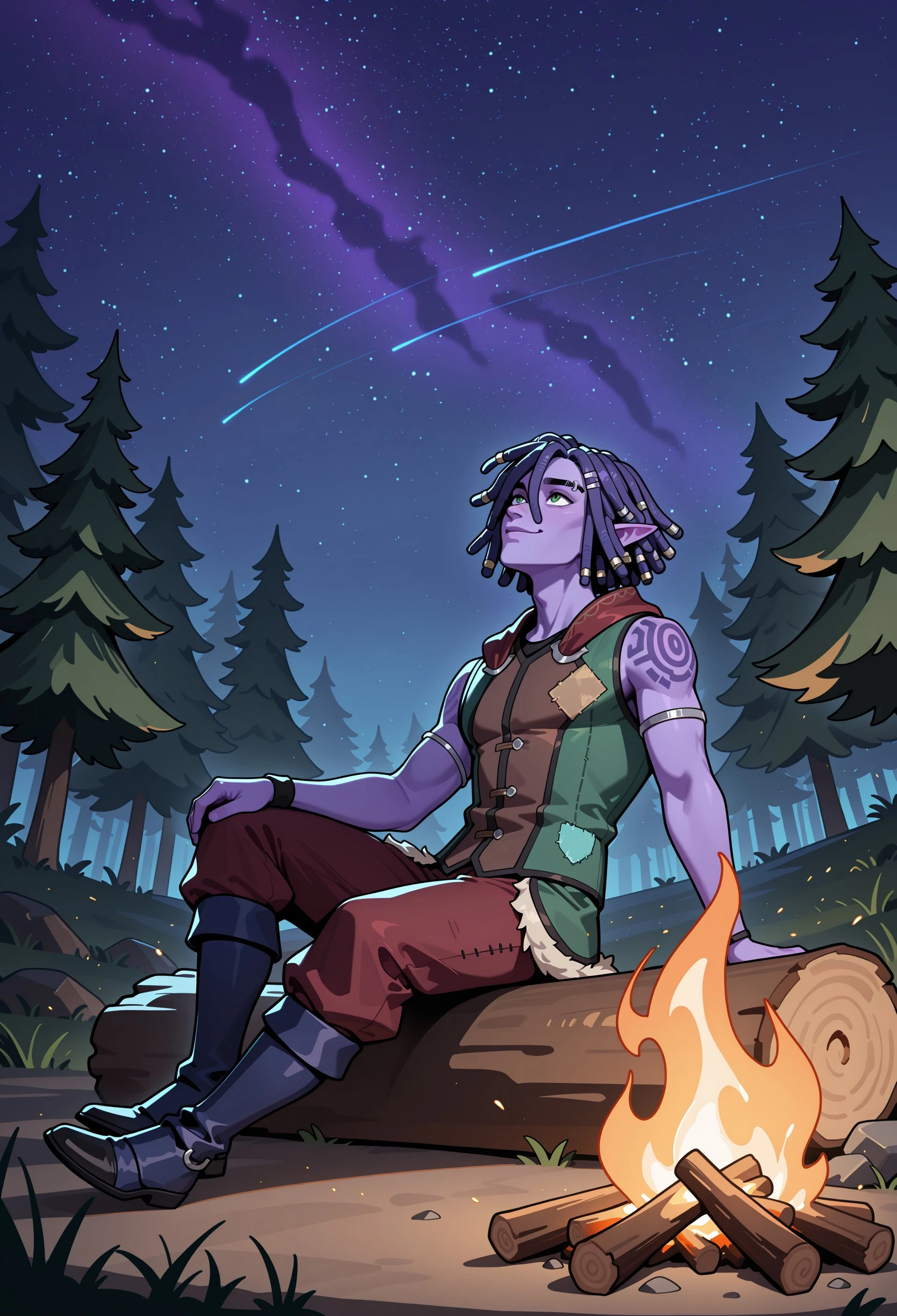 PaliaHassian, 1boy, purple hair, short hair, dreadlocks, hair between eyes, silver hair ornament, pointy ears, green eyes, purple skin, shoulder tattoo, eyebrow piercing,