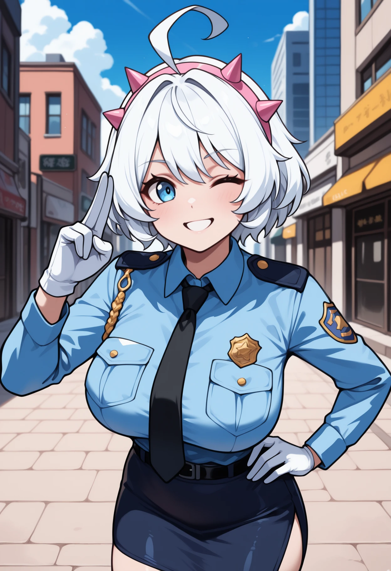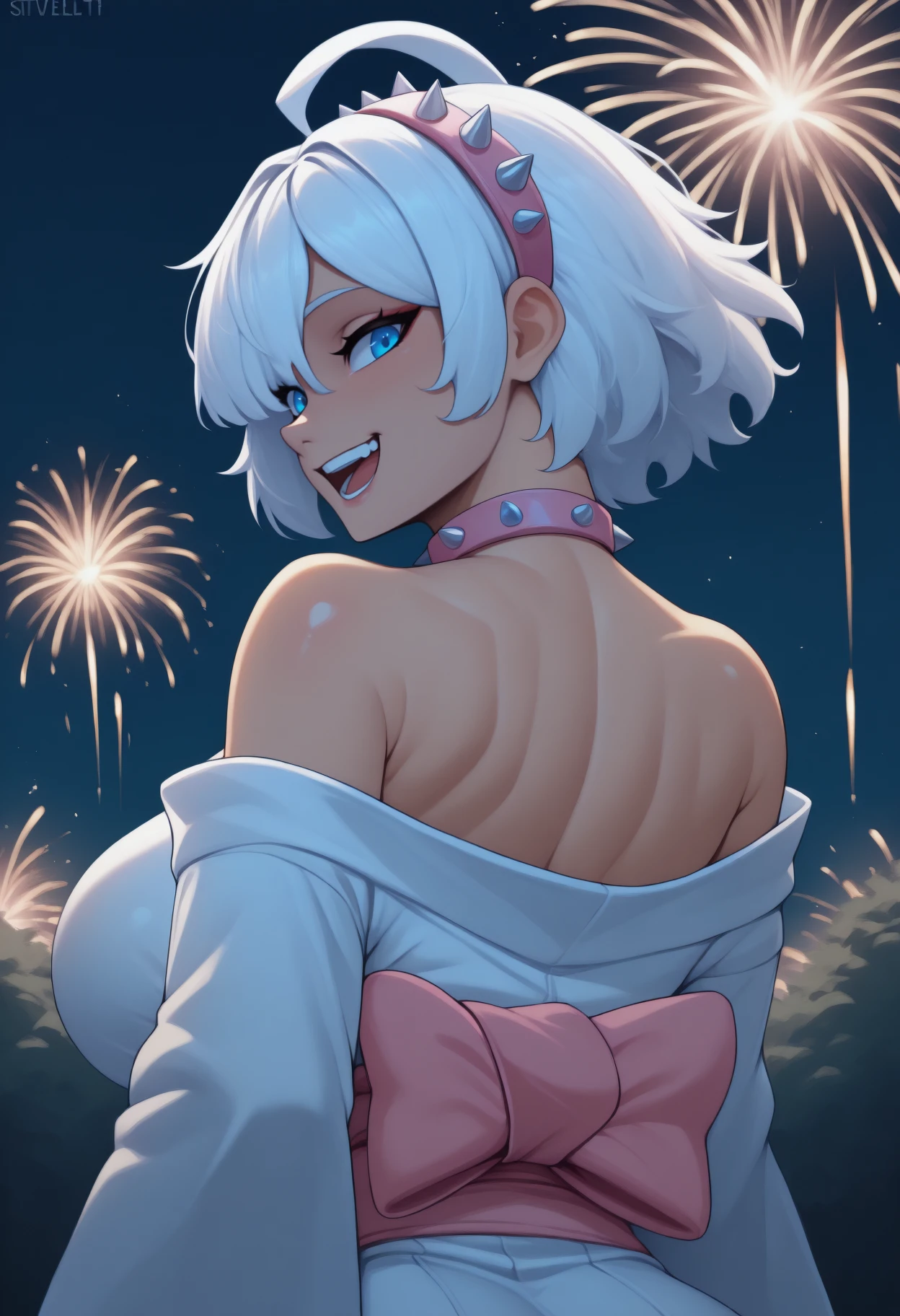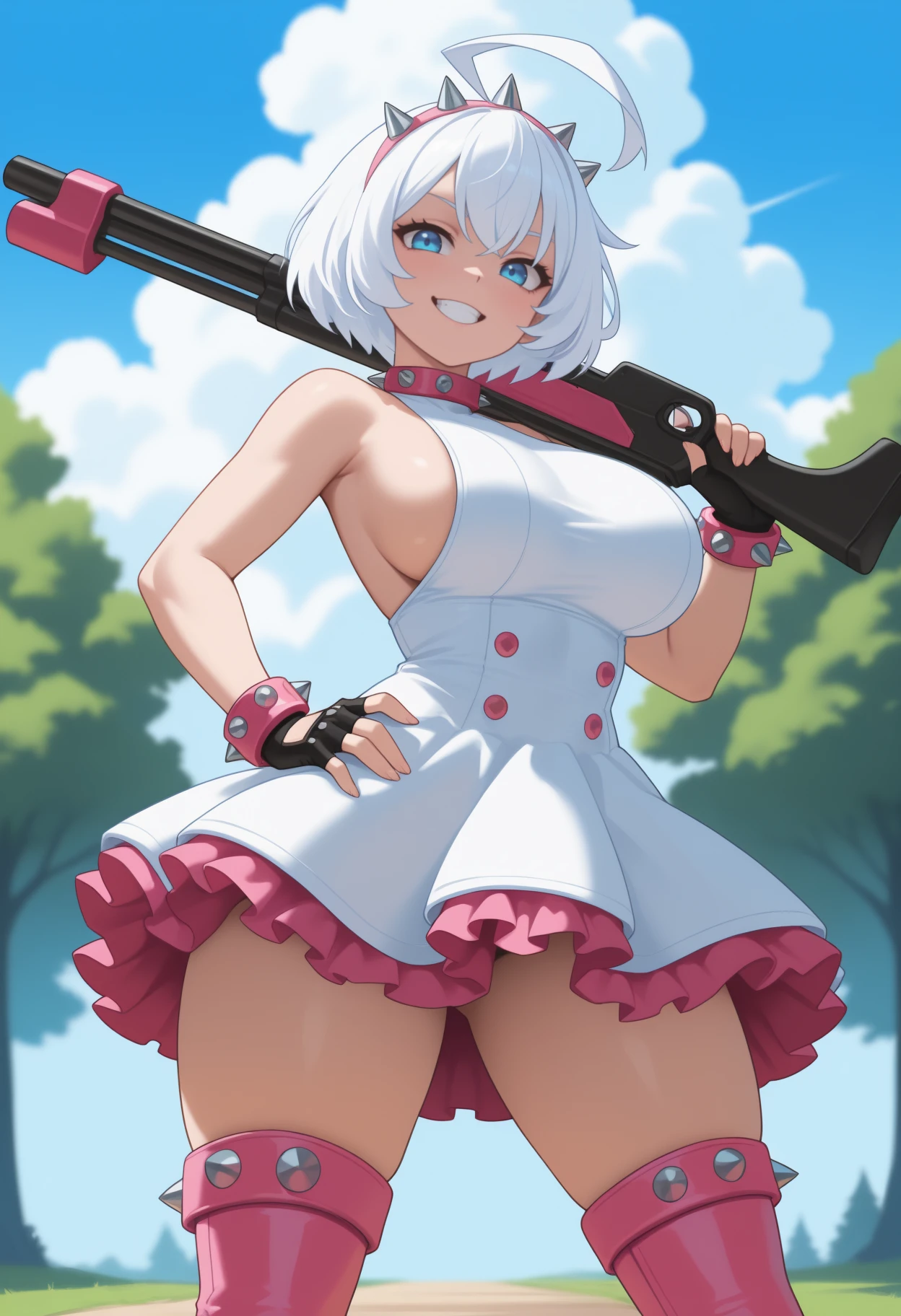 strivelpht, short hair, white hair, huge ahoge, pink hairband, spiked hairband, blue eyes, large breasts