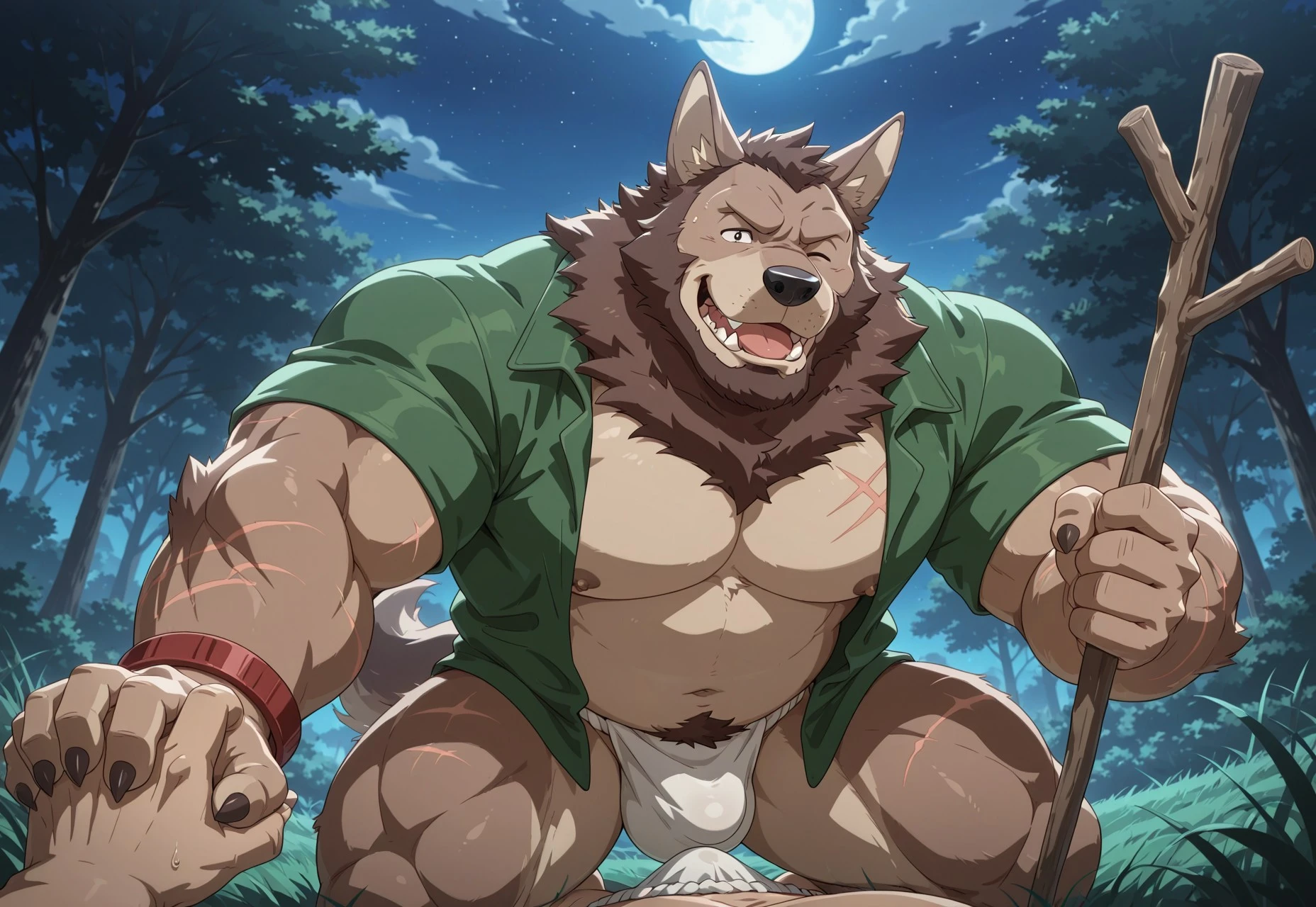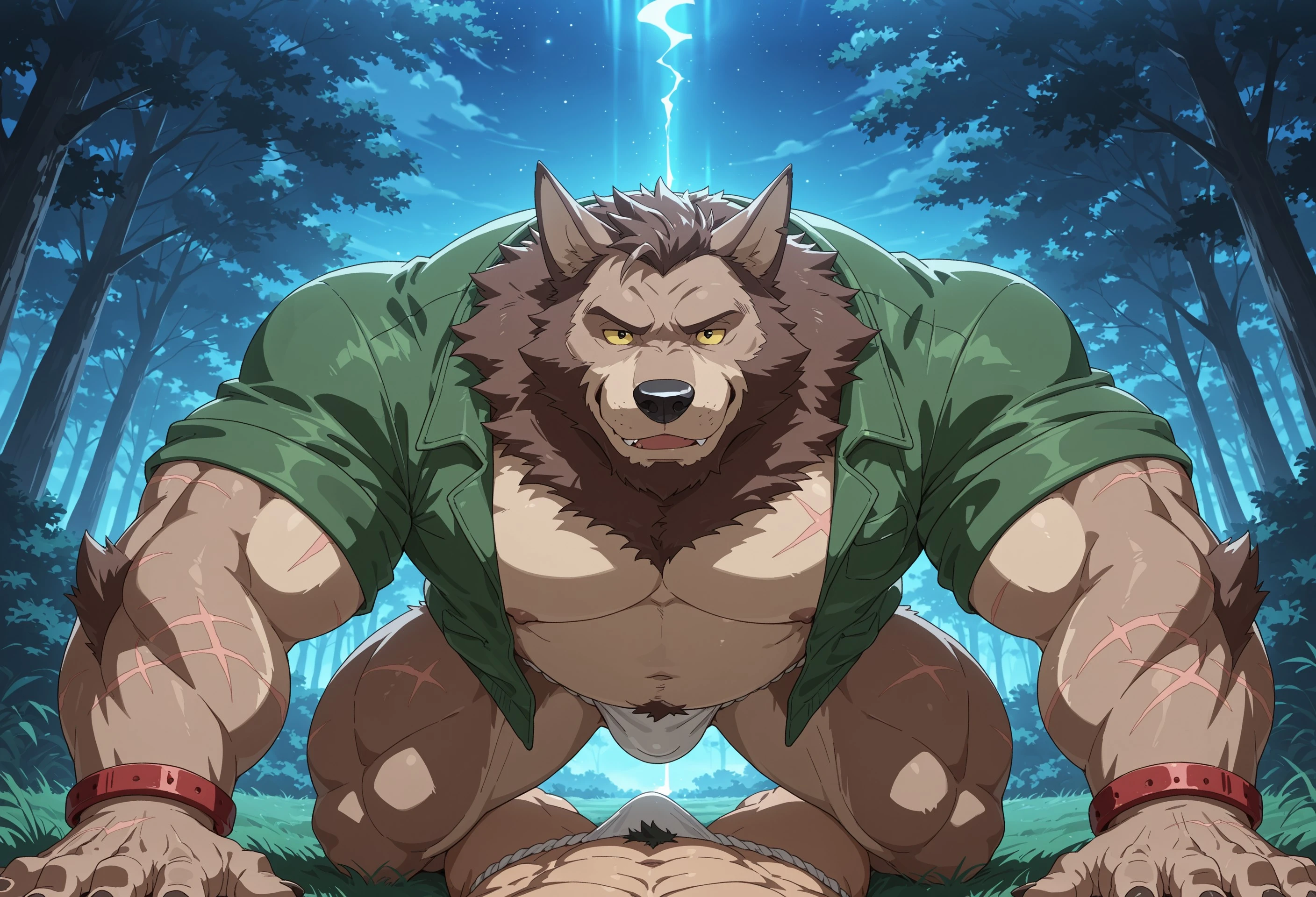 Caleb, werewolf, wolf ears, black nose, muscular, gut, light brown fur, darker brown hair, beard, brown mane, lighter fur on chest, scars on body, yellow sclera, teeth fang, small black eyes, no eyebrows, open chested short sleeve green jacket, red bracelet, white fundoshi underwear, hind legs, wolf feet, sharp dark brown nails, dagger strap on leg