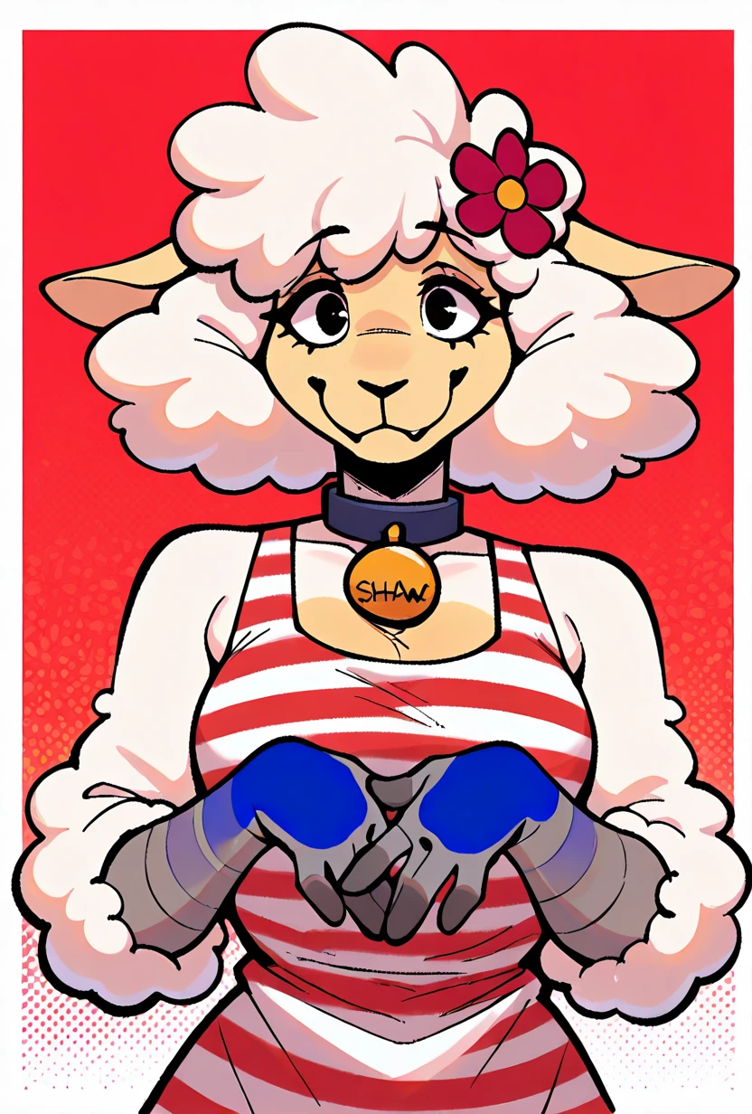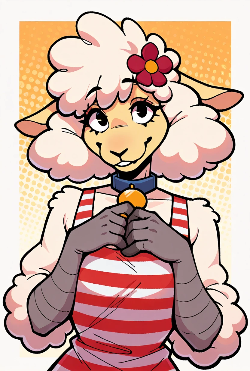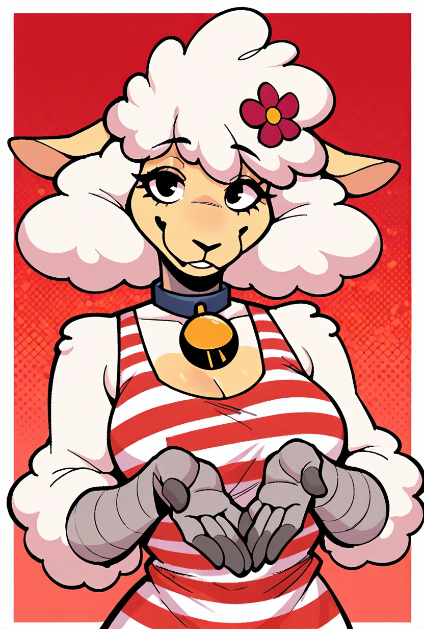shawf, 1girl, solo, white hair, furry female, smile, hair ornament, animal ears, hair flower, sheep girl, neck bell, Red striped dress, grey hands,
