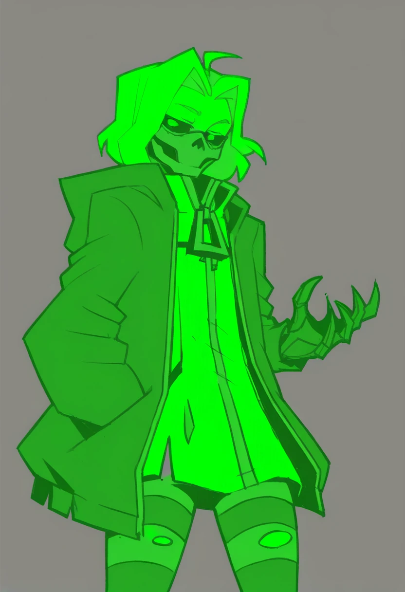ghost girl, short hair, green theme, boots, jacket, skull ski mask, black sclera, green eyes, skeleton hands, robotic hands, zipper, zipper pull tab, leggings