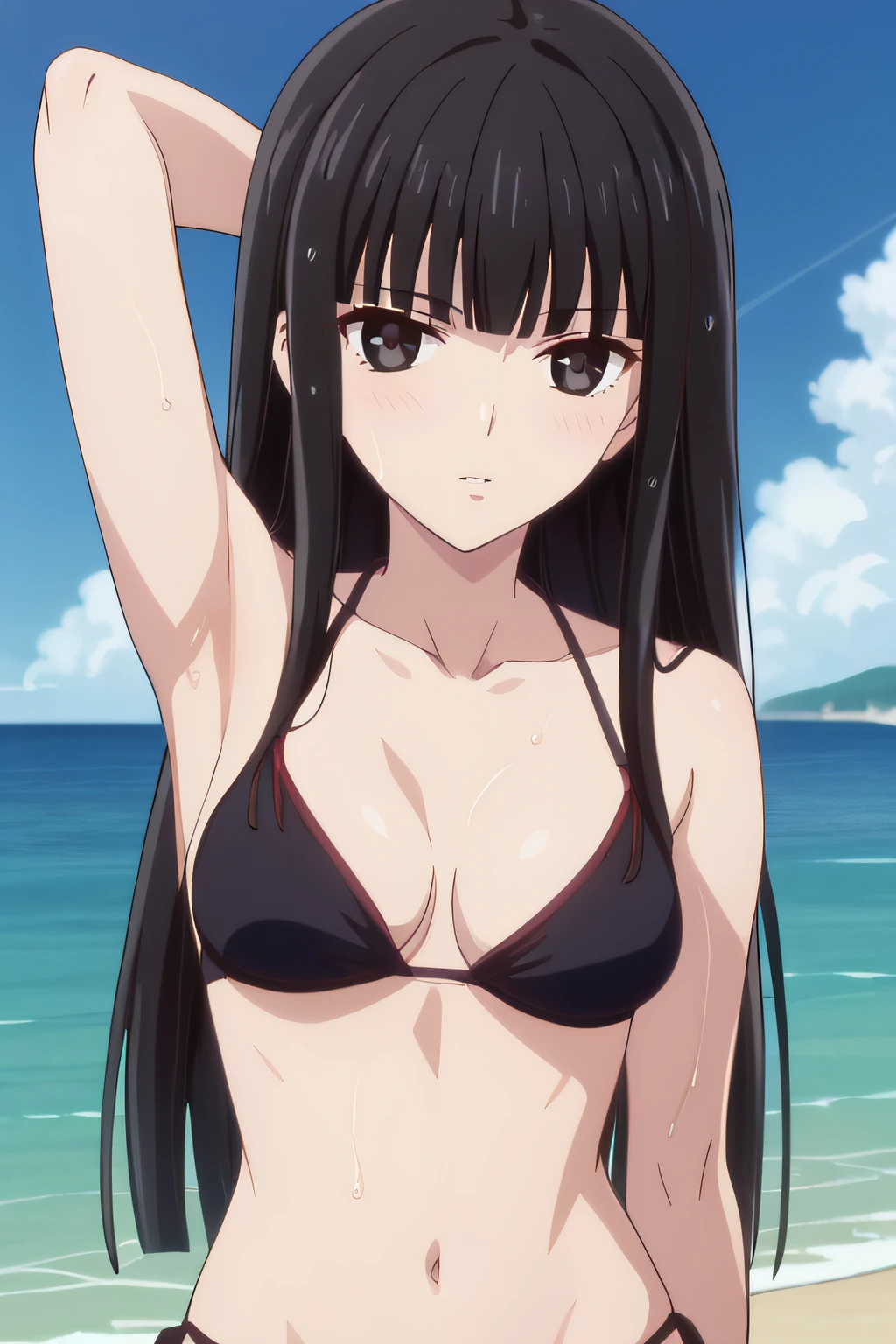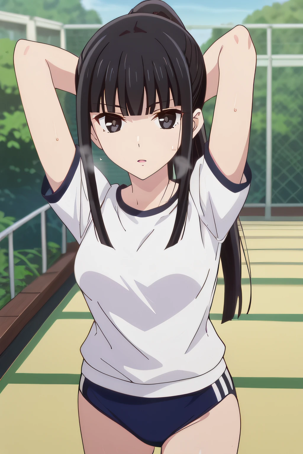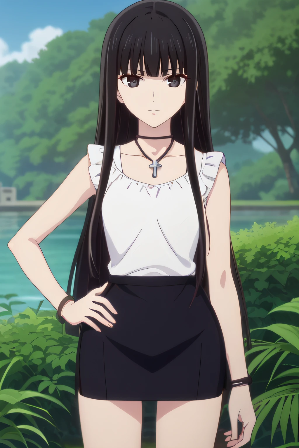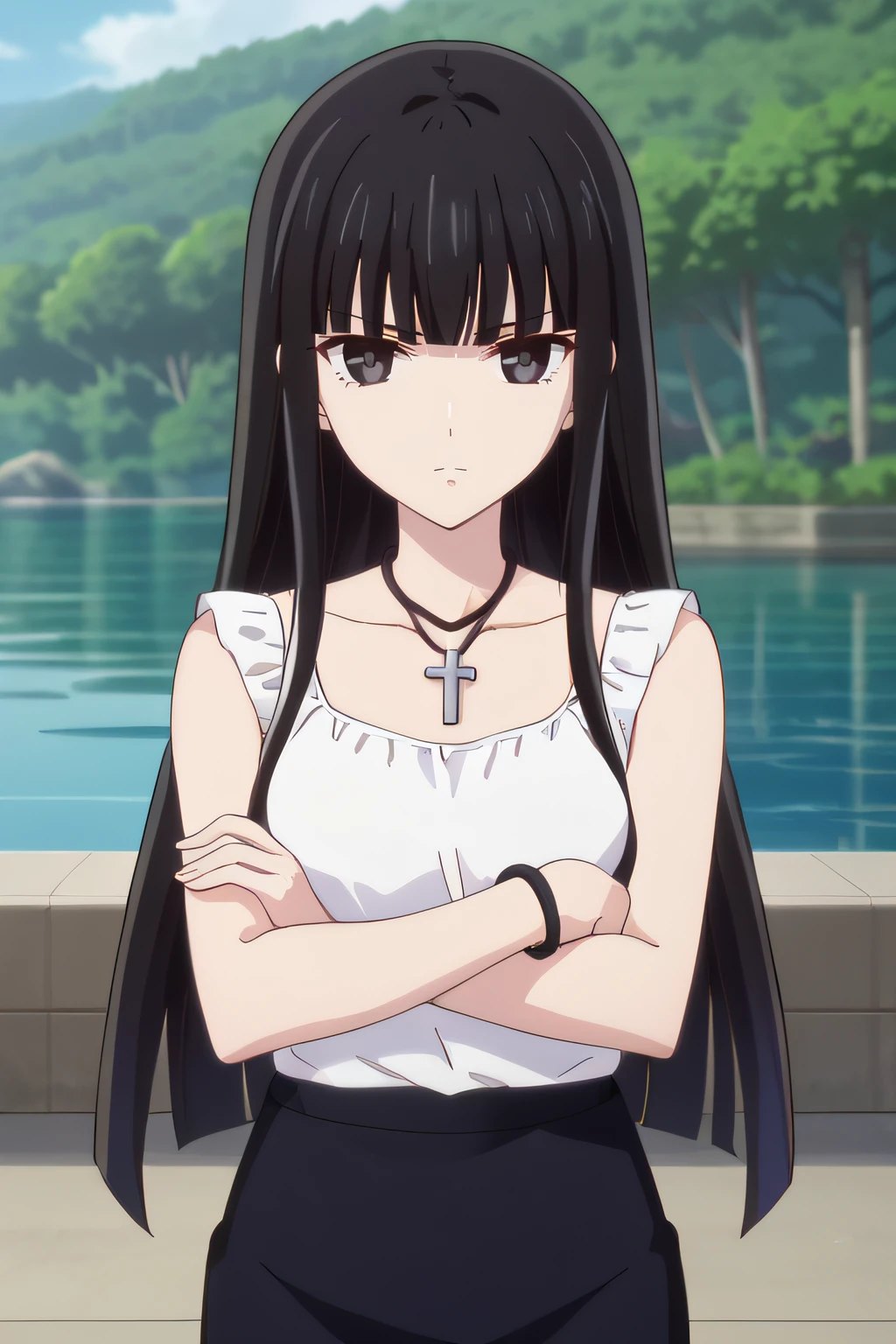 medium breasts, collarbone, cross necklace, white shirt, sleeveless, black skirt, black bracelet, pencil skirt, thighs