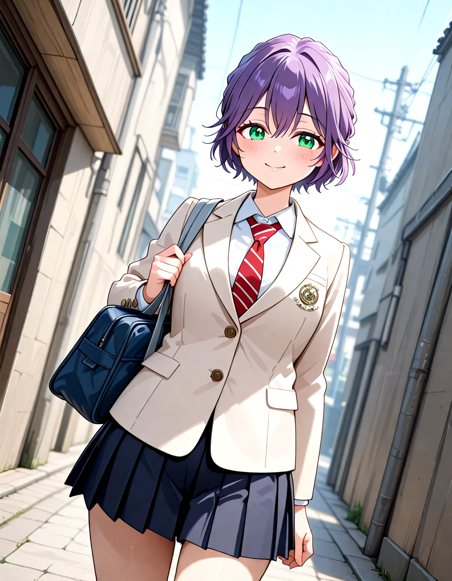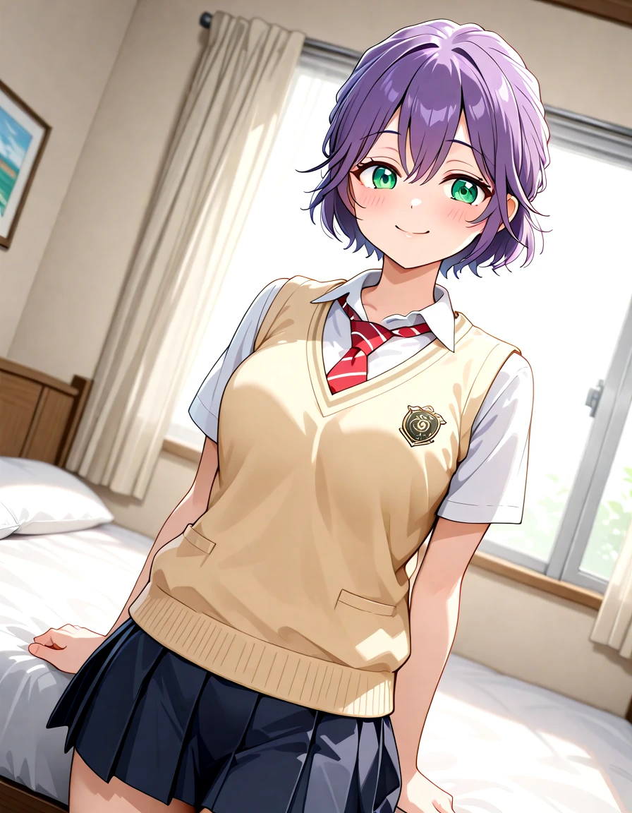 Hiro_Segawa_Kakkou, short hair, green eyes, purple hair, hair between eyes, breasts