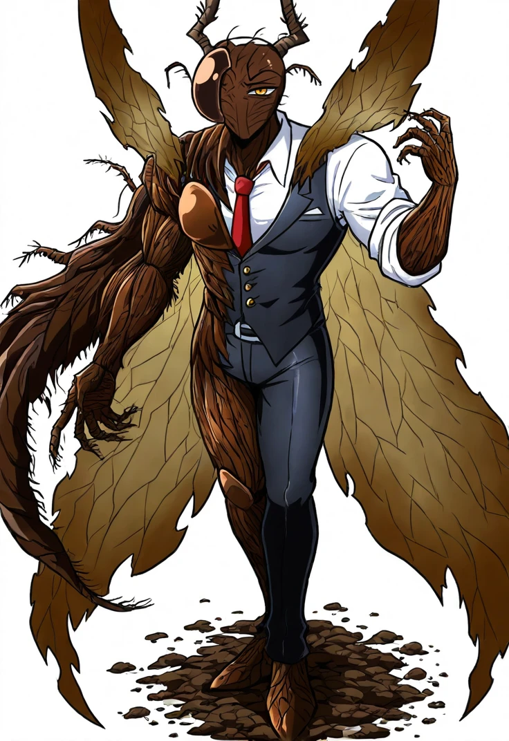 golden eyes, roach, monster, antlers, insect wings, no mouth, brown armor, asymmetrical clothes, white shirt, rolled up sleeves, red necktie, black vest, black pants