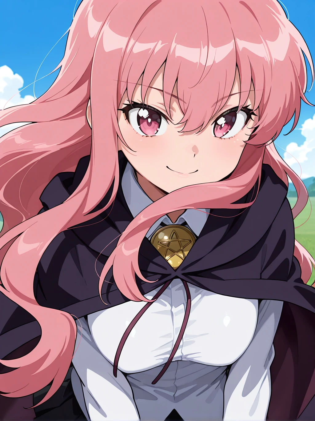 Prompt: 1girl, solo, Louise-Liver020, black cape. black long cape, pink hair, long hair, pink eyes, white shirt, collar, gold collar, black skirt, mini skirt, black boots, long boots, louise francoise le blanc de la valliere, hair between eyes, red ribbon, red ribbon, gold collar, pentagram collar, small breasts