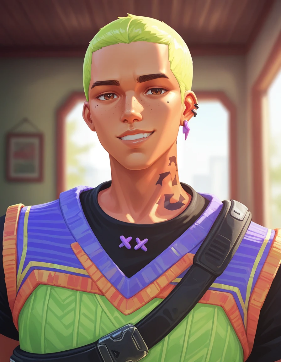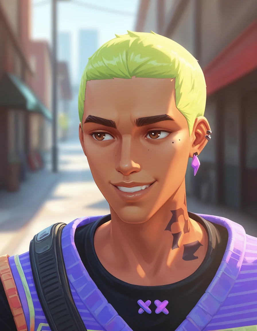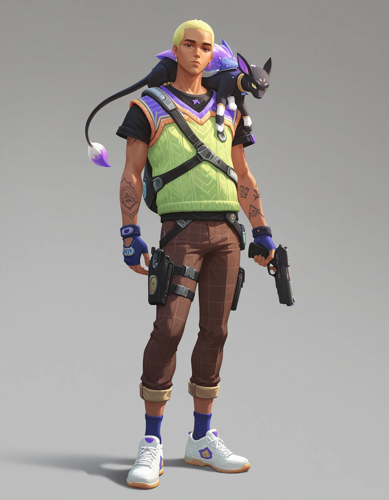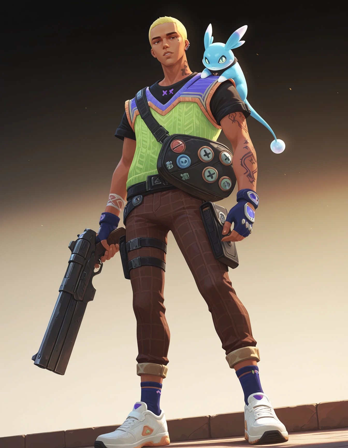 1boy,mai_gekkov,dark-skinned_male,very_short_hair,blonde_hair,brown_eyes,mole,earrings,arm_tattoo,shirt,short_sleeves,green_vest,brown_pants,plaid,fingerless_gloves,black_gloves,blue_socks,white_sneakers,backpack,holding_handgun,animal_on_shoulderRecommend preferred Strength: 0.7~1.