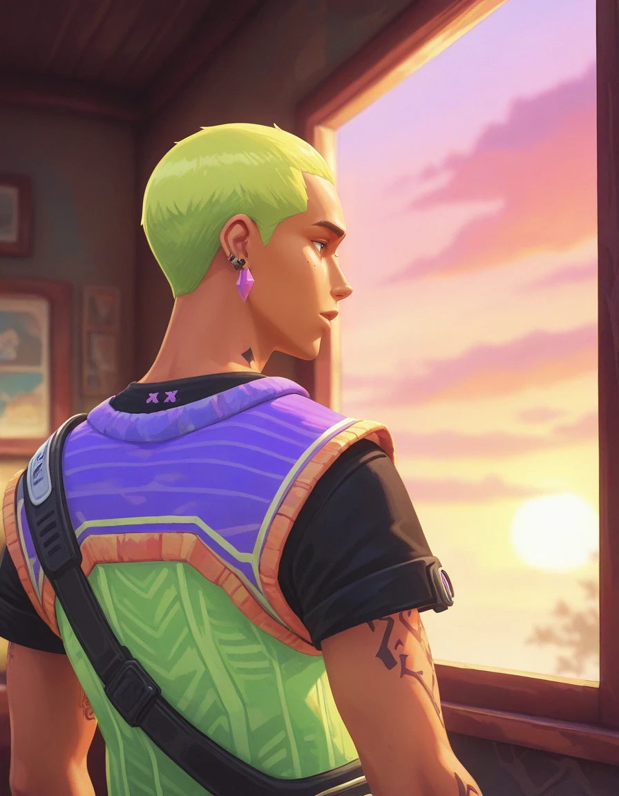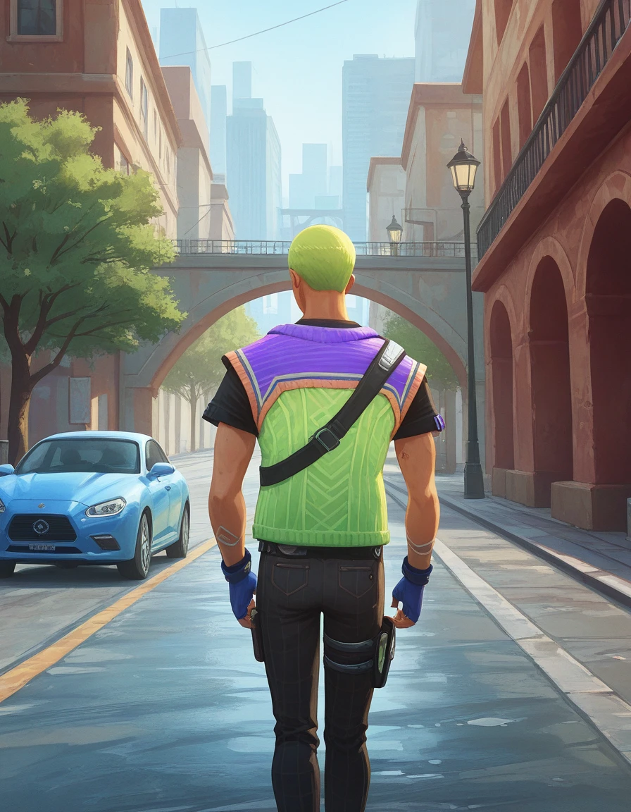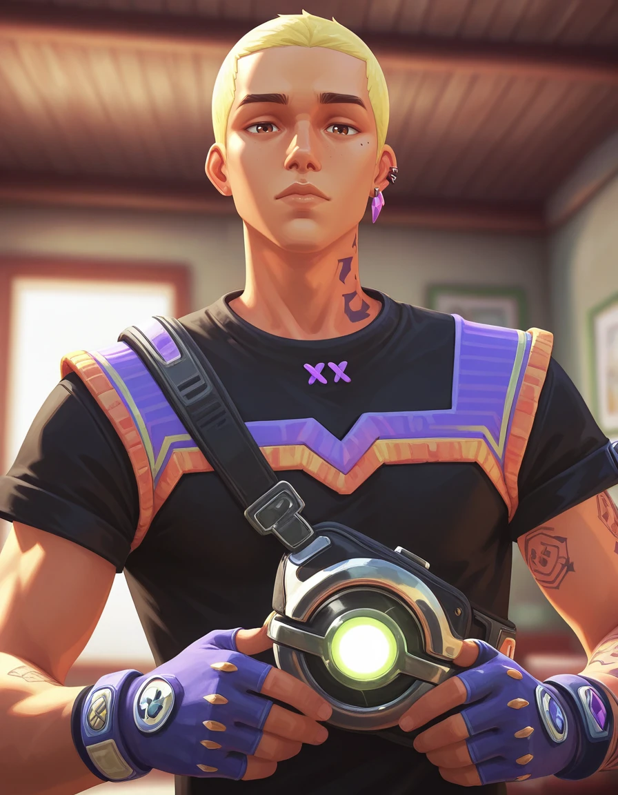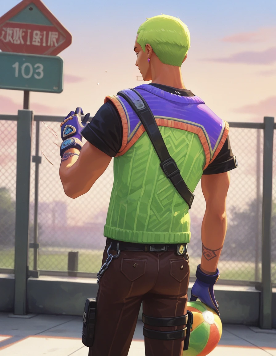 1boy,mai_gekkov,dark-skinned_male,very_short_hair,blonde_hair,brown_eyes,mole,earrings,arm_tattoo,shirt,short_sleeves,green_vest,brown_pants,plaid,fingerless_gloves,black_gloves,blue_socks,white_sneakers,backpack,holding_handgun,animal_on_shoulderRecommend preferred Strength: 0.7~1.