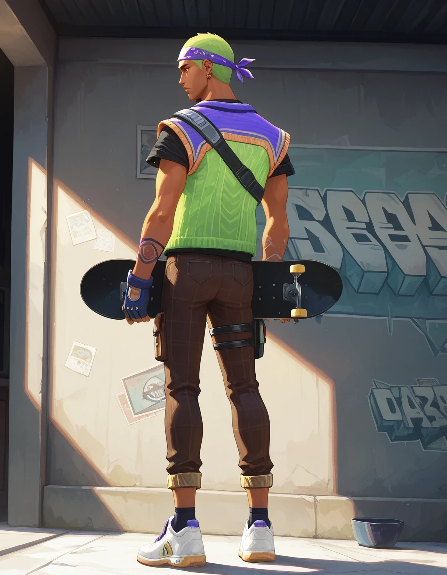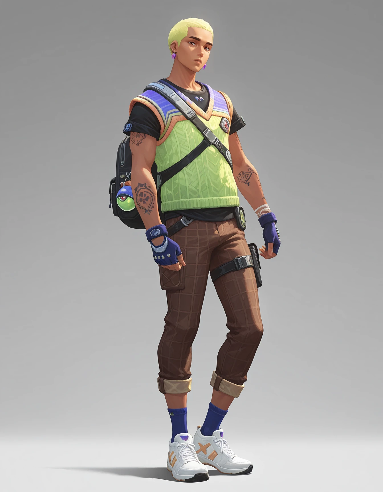 1boy,mai_gekkov,dark-skinned_male,very_short_hair,blonde_hair,brown_eyes,mole,earrings,arm_tattoo,shirt,short_sleeves,green_vest,brown_pants,plaid,fingerless_gloves,black_gloves,blue_socks,white_sneakers,backpack