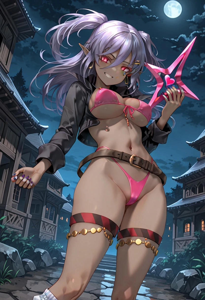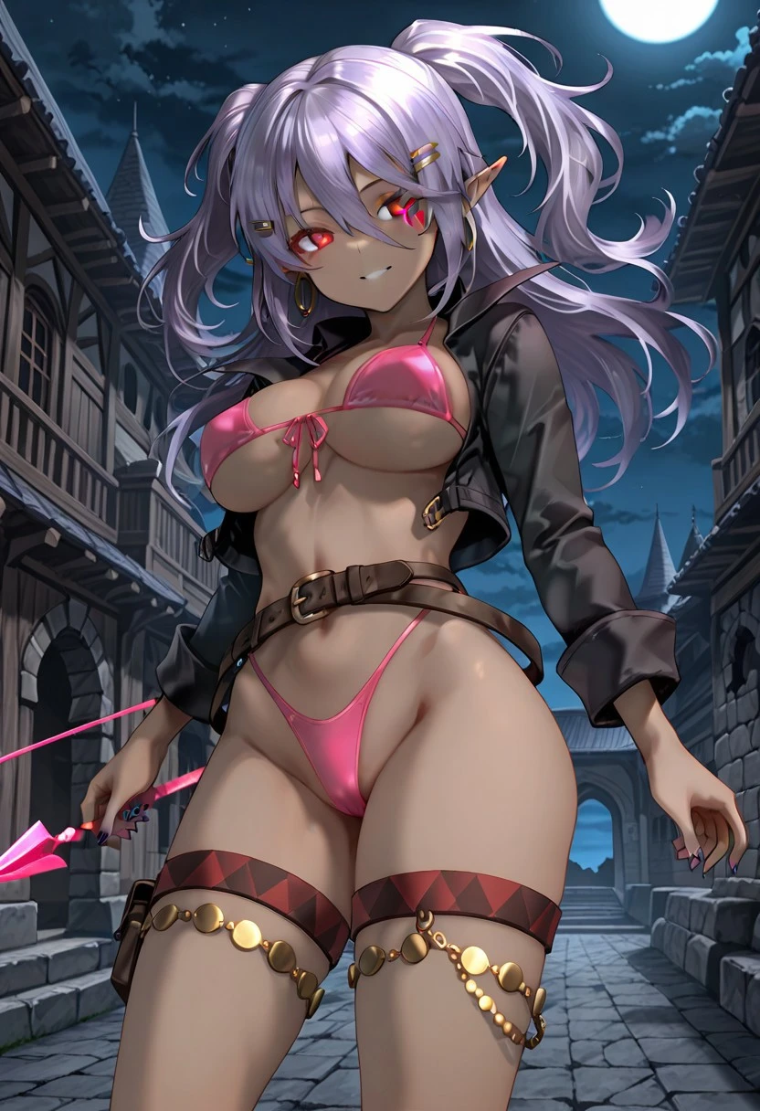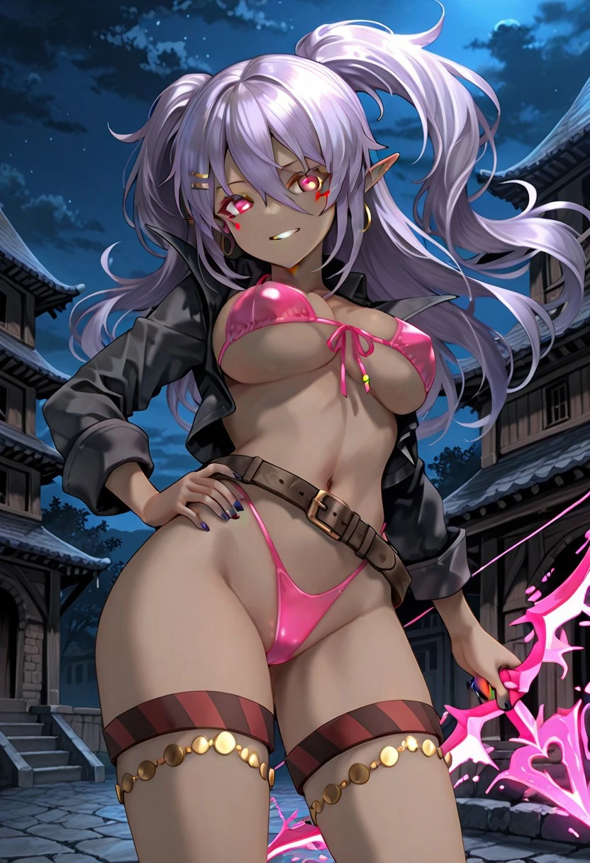 RogueElfMGP, 1girl, solo, dark-skinned female, pointy ears, red eyes, dark skin, large breasts, dark elf, holding bow, bow \(weapon\), long hair, hair between eyes, jewelry, hairclip, earrings, twintails, two side up, thigh strap, purple hair, red eyes, belt, black jacket, swimsuit, highleg pink bikini, boots, underboob, hair ornament, purple nails, navel, open clothes, loose socks, long sleeves, arrow \(projectile\), facial mark, 1 pink heart below one eye,Description