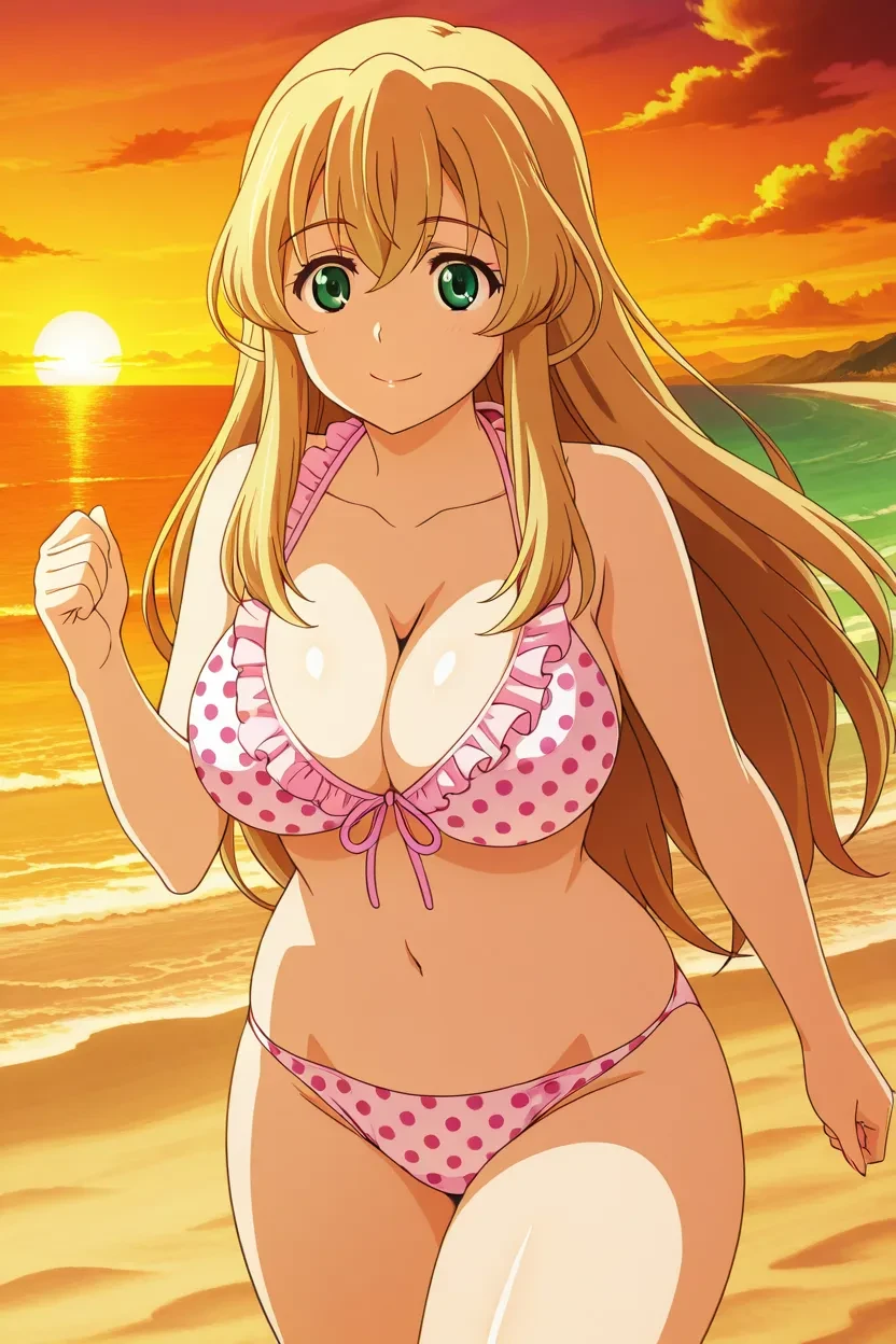 girl Kotori Takatori (Brynhildr in the Darkness), green eyes, blonde hair, long hair, glossy lips, huge breasts, curvy, extremely sexy, wide hips, thick thighs, bikini, sexy bikini, polka dot bikini, beach,