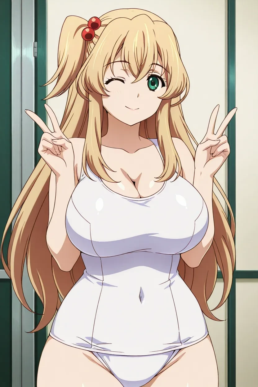 1girl Kotori Takatori (Brynhildr in the Darkness), green eyes, blonde hair, long hair, glossy lips, huge breasts, curvy, extremely sexy, wide hips, thick thighs, school swim suit,