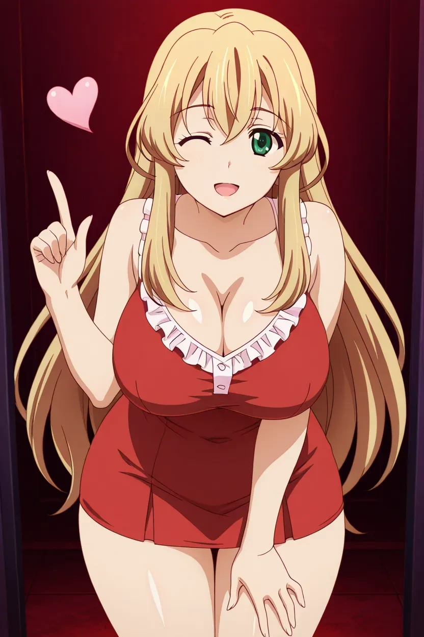 1girl Kotori Takatori (Brynhildr in the Darkness), green eyes, blonde hair, long hair, glossy lips, huge breasts, curvy, extremely sexy, wide hips, thick thighs, , fully , , , pubic hair, Brynhildr in the Darkness_art_style, HD, Hi-res, anime_source, anime_coloring