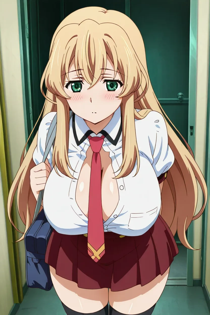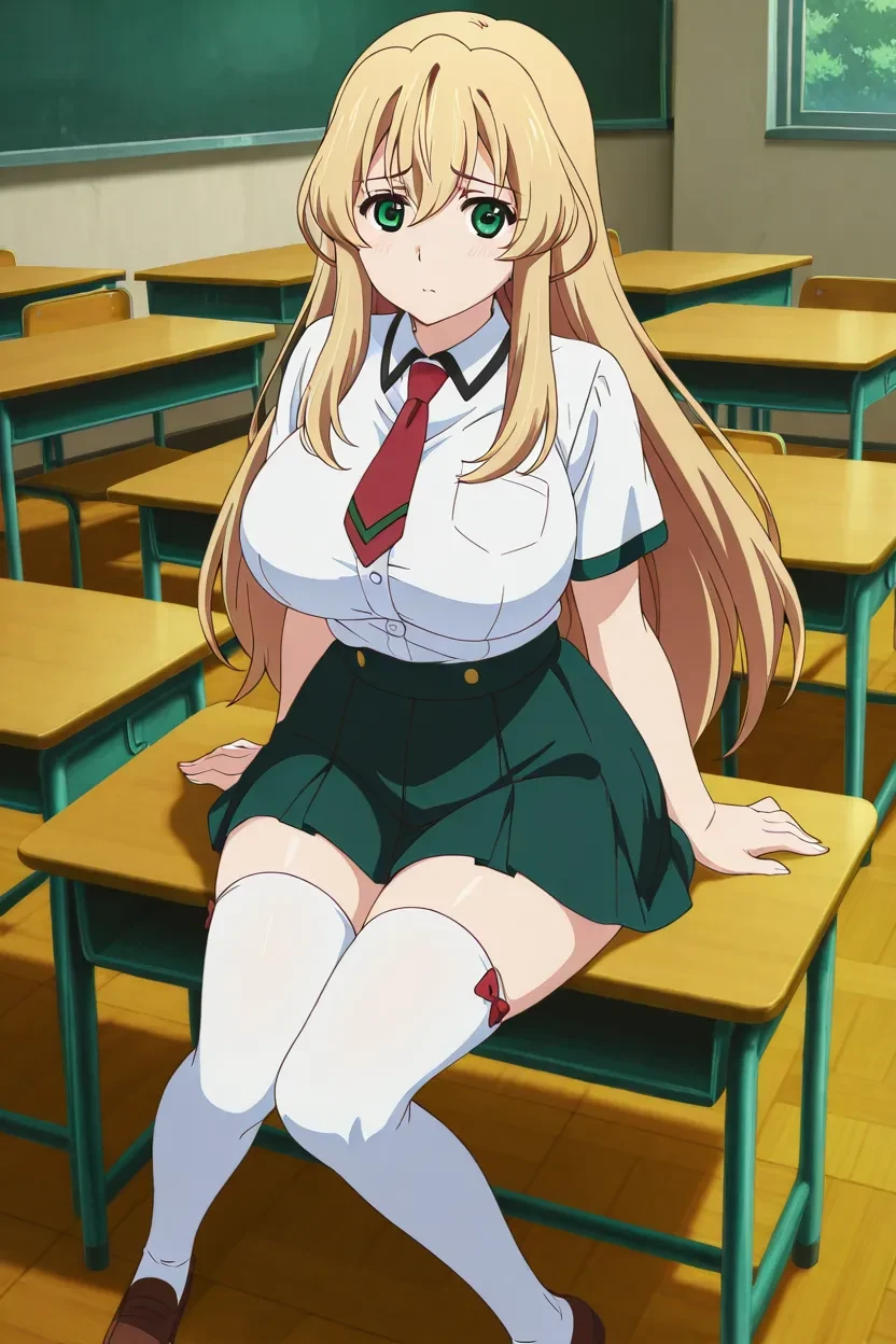 1girl Kotori Takatori (Brynhildr in the Darkness), green eyes, blonde hair, long hair, glossy lips, huge breasts, curvy, extremely sexy, wide hips, thick thighs, school uniform, shirt, skirt, necktie thigh highs, shoes, school, classroom, sitting at desk