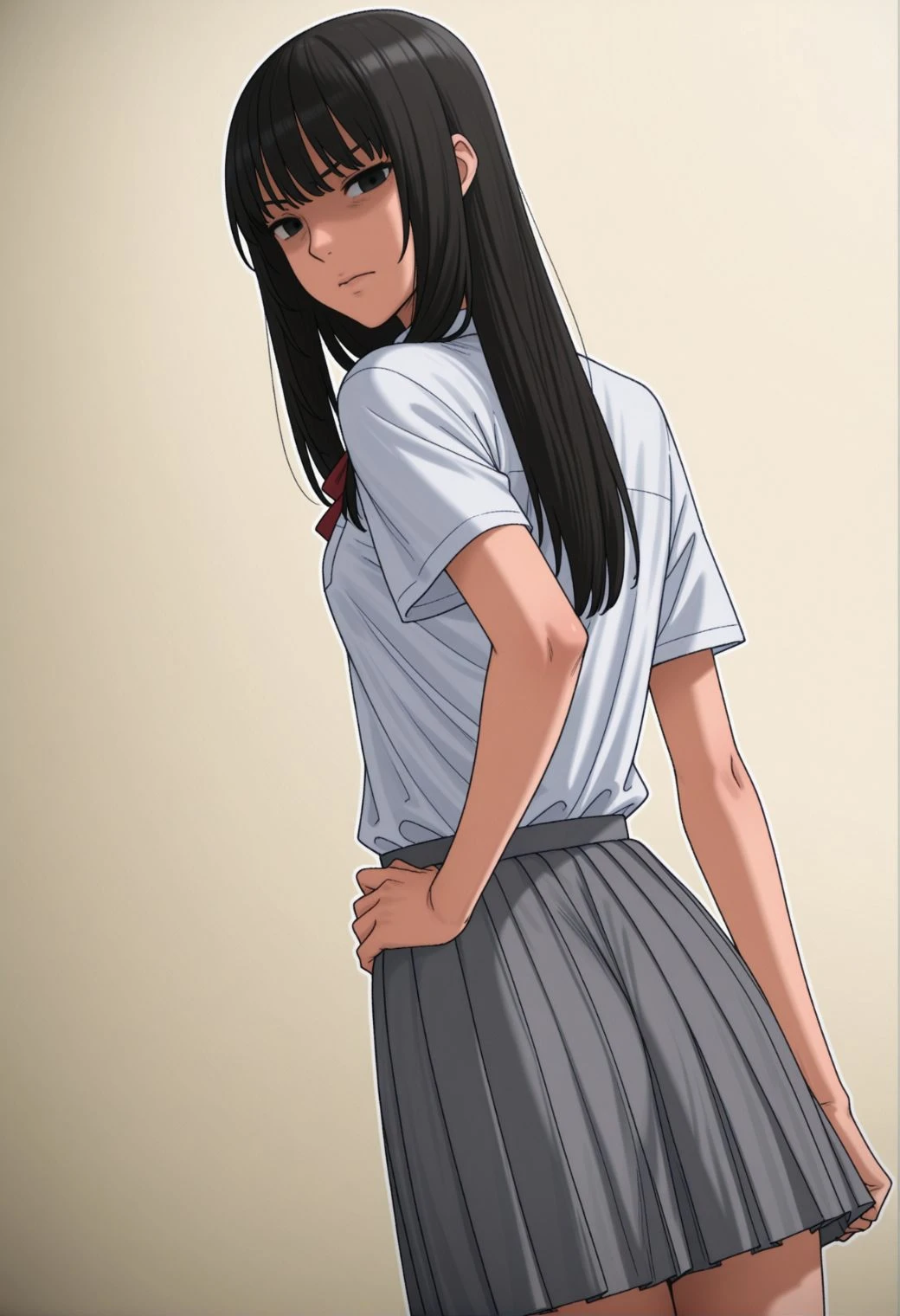 arutienuda, black hair, black eyes, bangs, long hair, medium breasts,