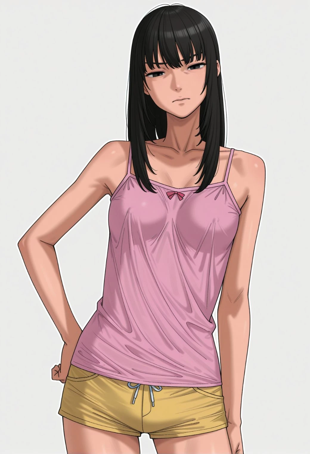 - pink camisole, yellow short shorts,