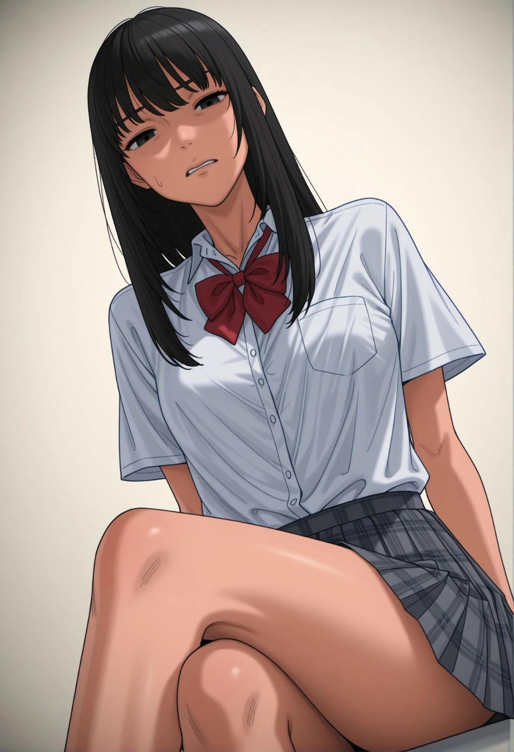 - white shirt, short sleeves, dress shirt, red bow, pleated skirt,