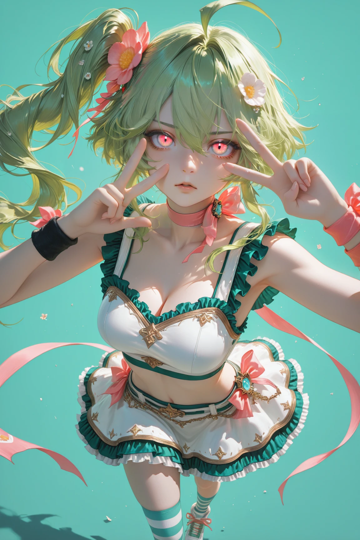 Optional clothing tags衣服2 :diertao,diermeryl asymmetrical legwear,diermeryl one striped thighhighs,diermeryl sleeveless,diermeryl miniskirt,diermeryl pink neck bow,diermeryl green and white skirt,cleavage,diermeryl green and white crop top,diermeryl hair flowers,diermeryl frills skirt,diermeryl green and white footwear,ribbon,diermeryl one green socks,wristband,