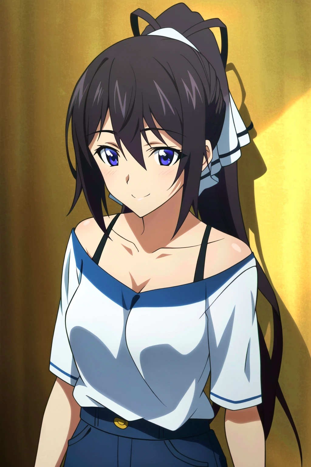 Houki Shinonono, 1girl, solo, long hair, ponytail, blue eyes, black hair, smile, casual, hair ribbon, purple eyes