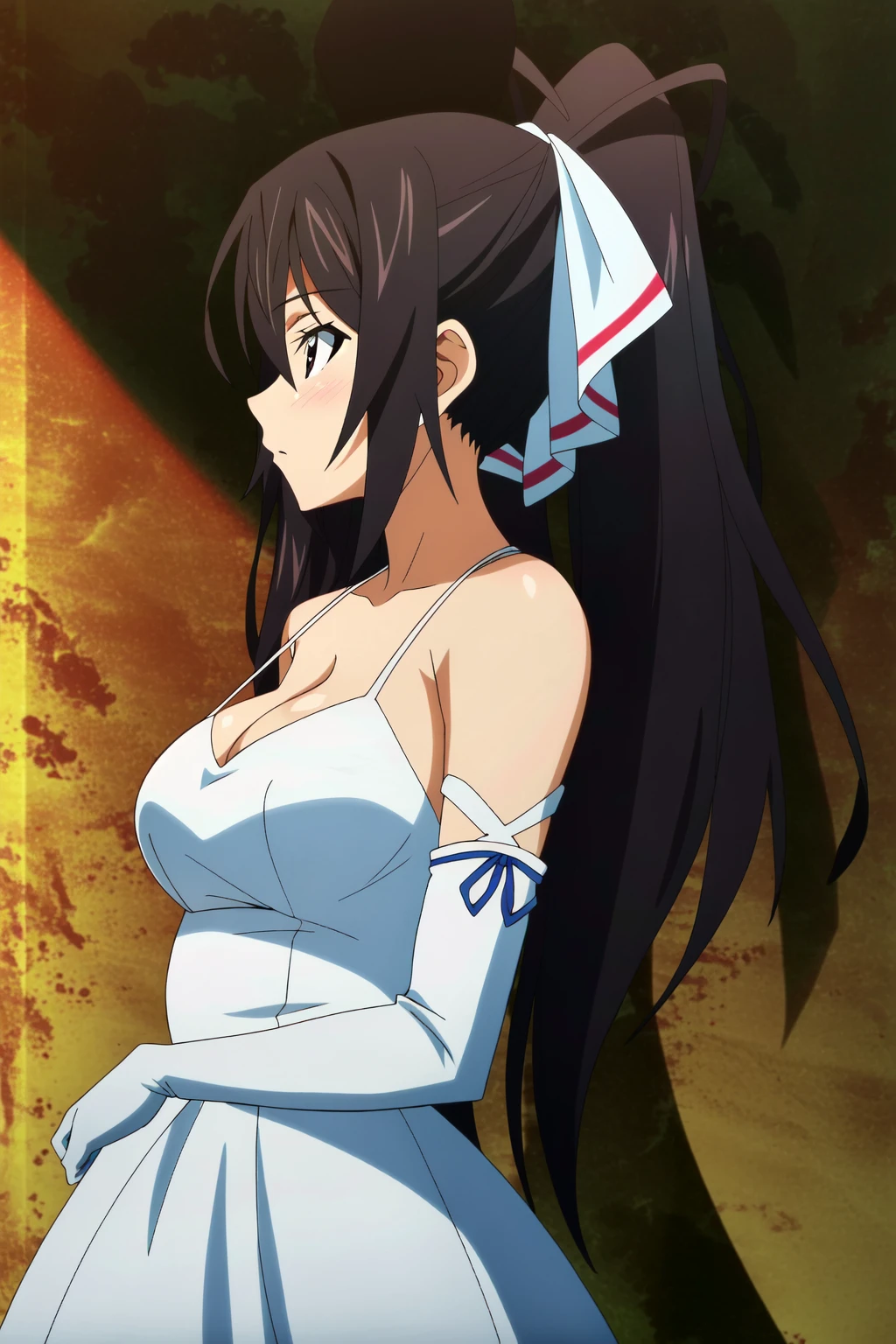 Houki Shinonono,1girl, breasts, long hair, cleavage, gloves, elbow gloves, dress, ponytail, black hair, medium breasts, solo