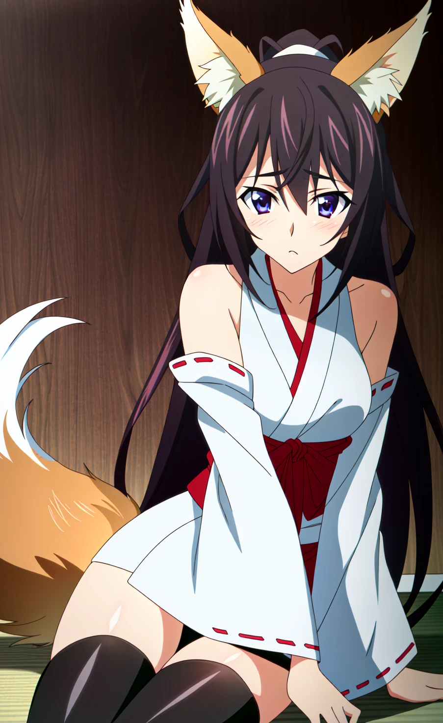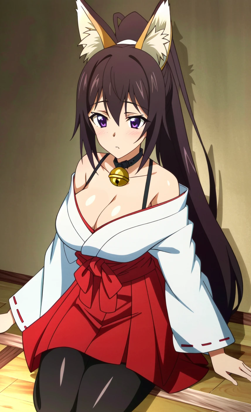Houki Shinonono, 1girl, animal ears, solo, tail, long hair, bell, fox ears, ponytail, japanese clothes, miko, breasts, fox tail, pantyhose, cleavage, neck bell, collar, purple eyes, black hair