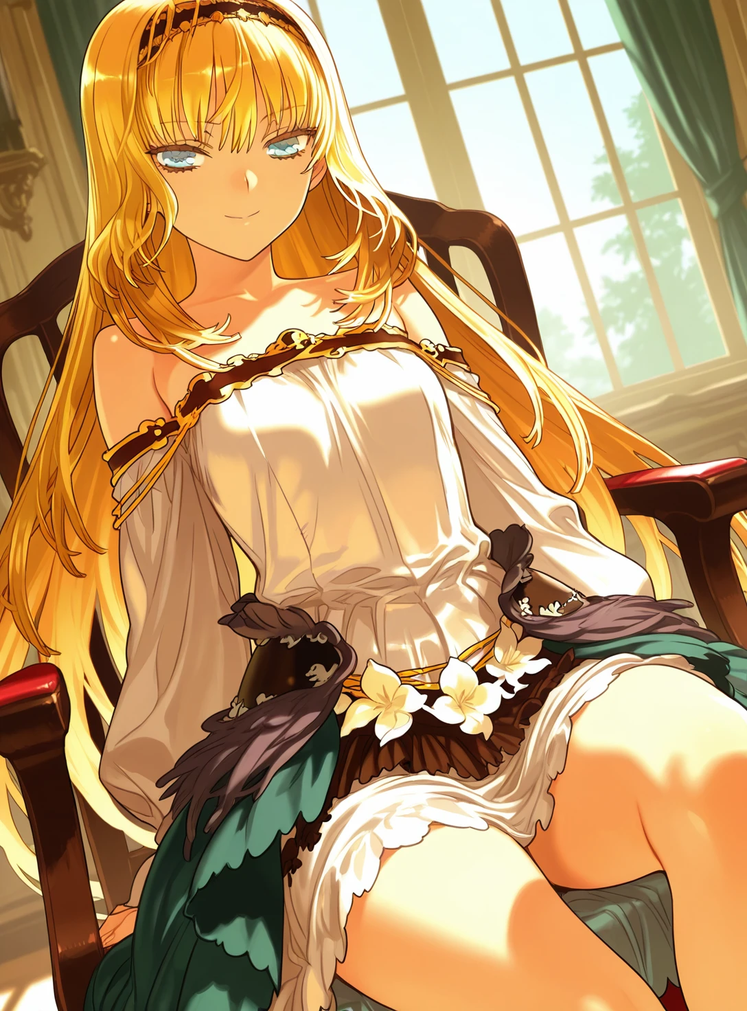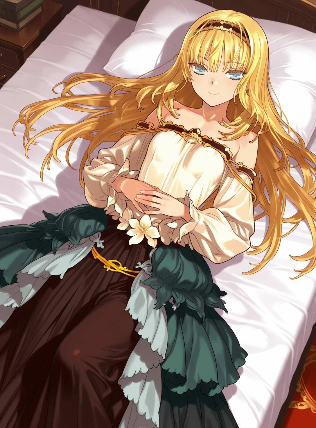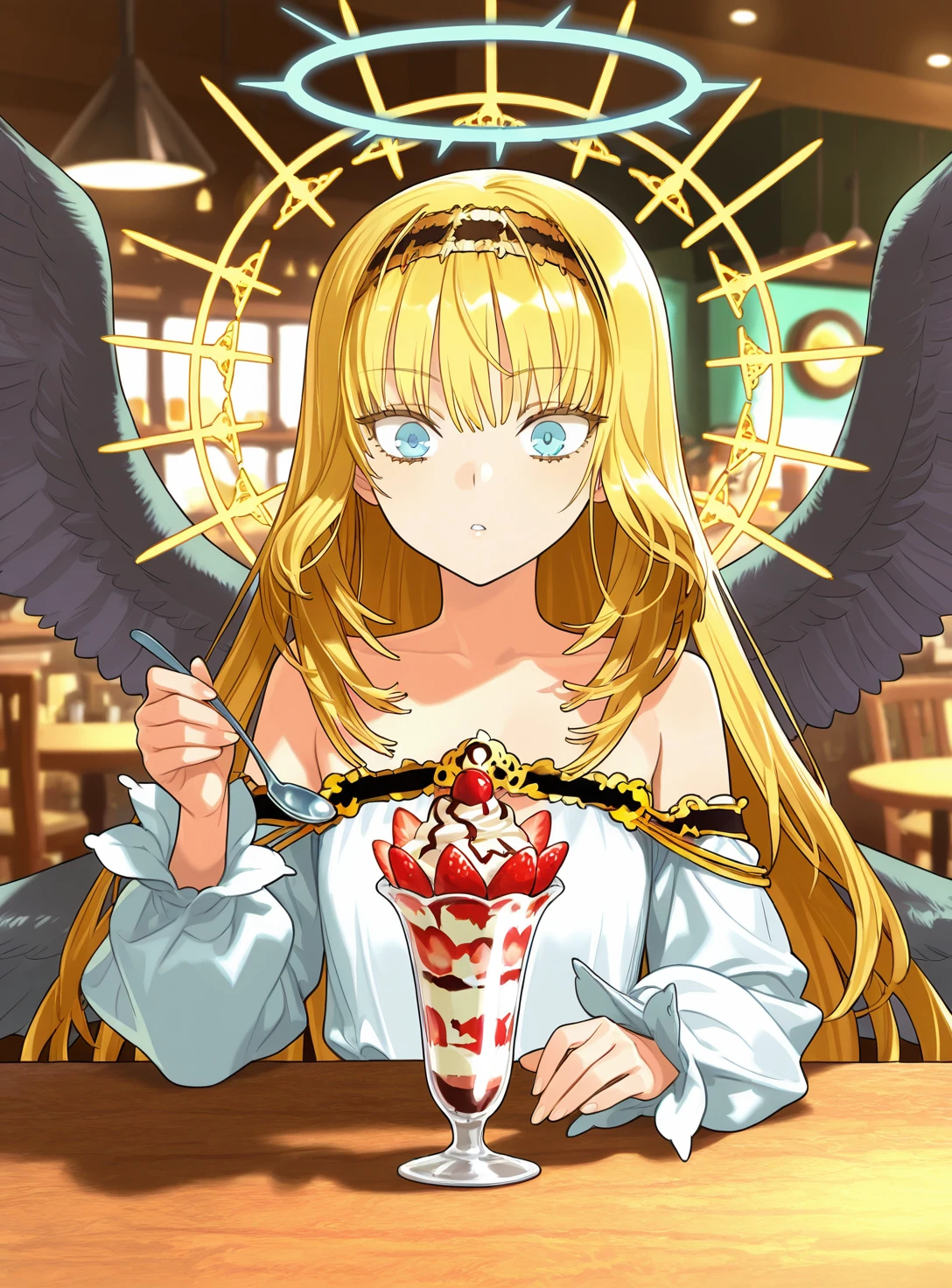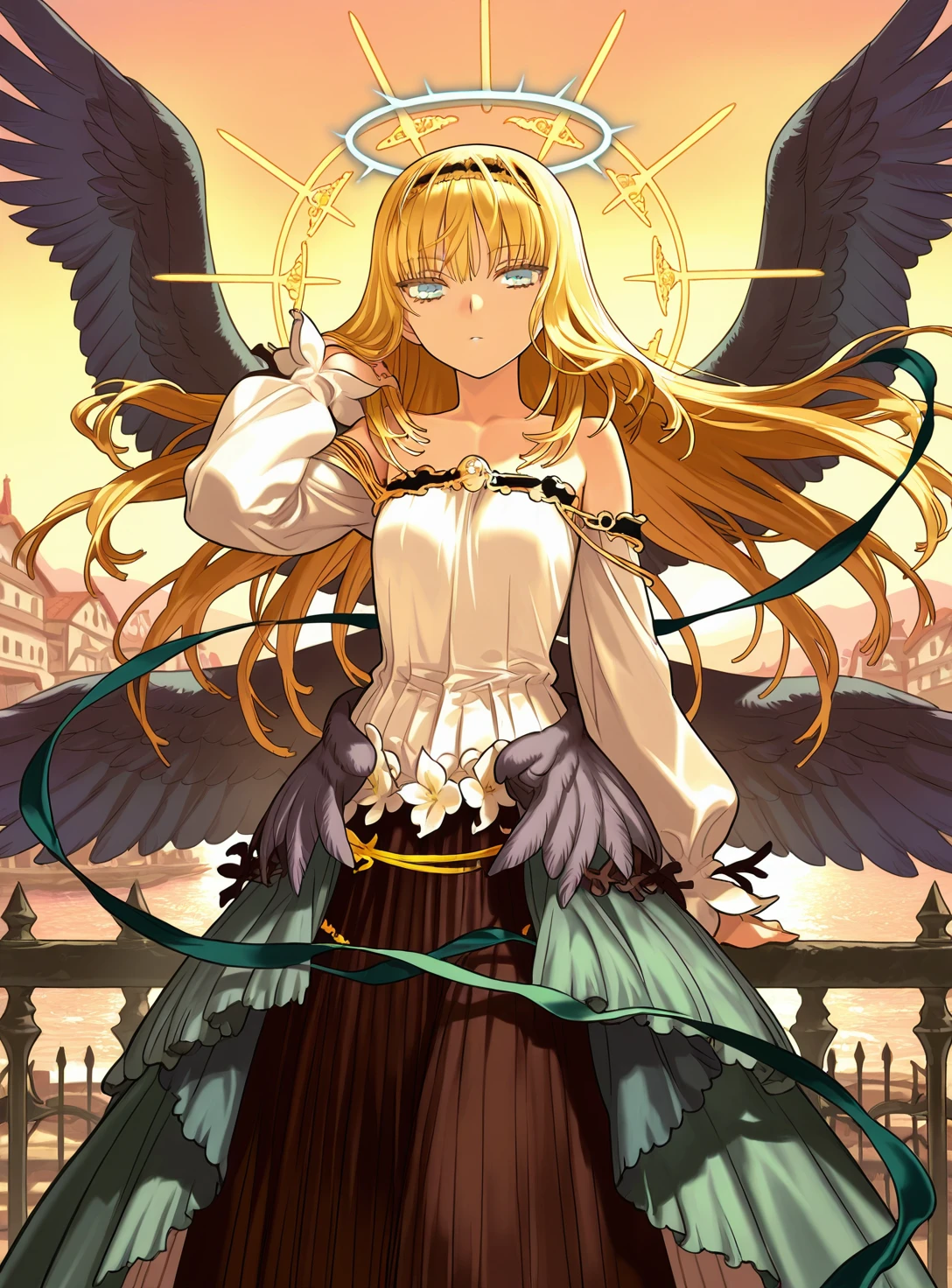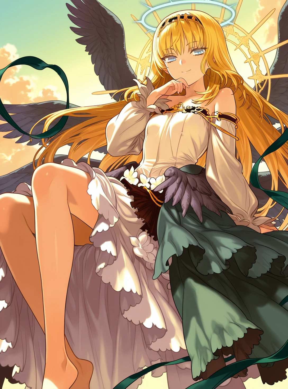 Goddess ALICE, long hair, halos, hairband, multiple wings, off-shoulder shirt, layered skirt, floating ribbon,