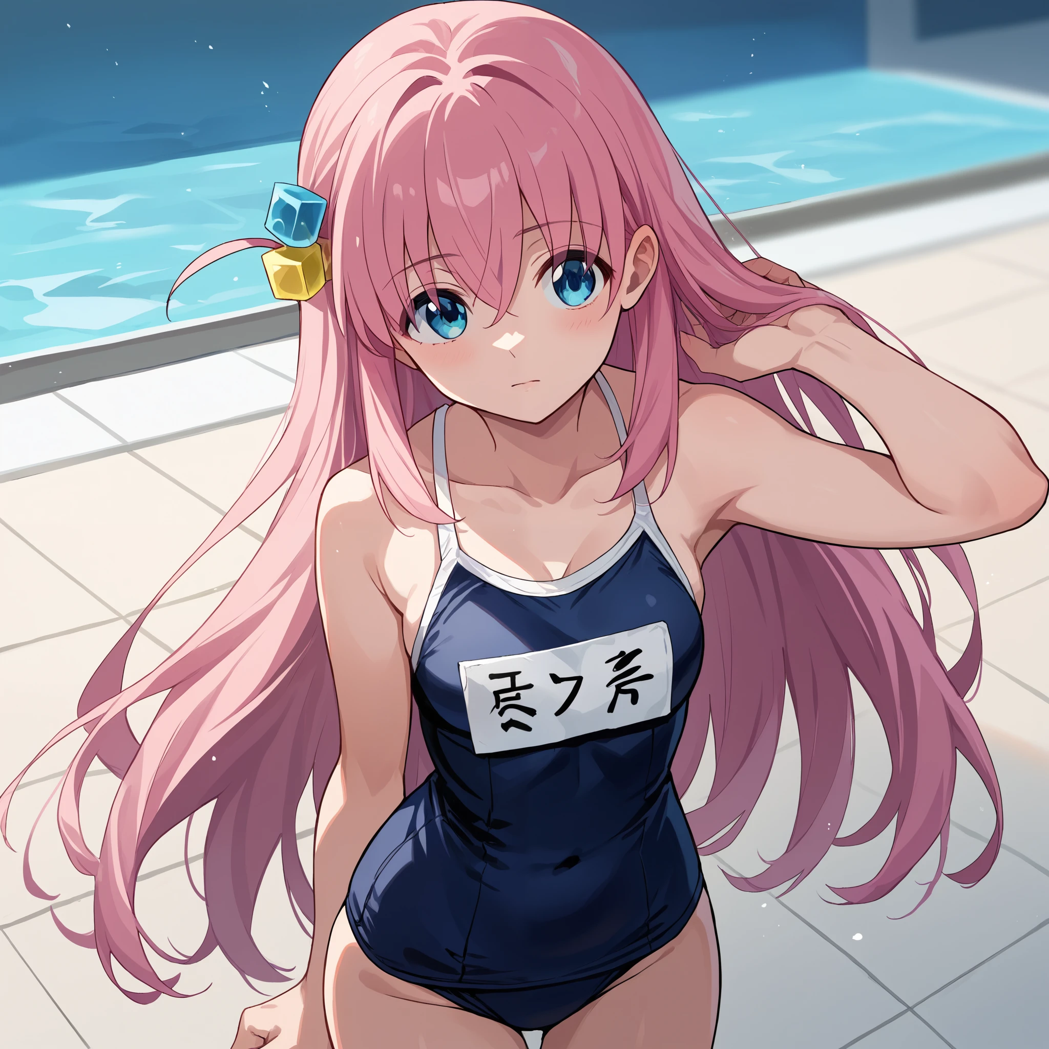 Default : bocchidef, blue eyes, pink hair, long hair, cube hair ornament, pink jacket, track jacket, long sleeves, pleated skirt, grey skirt, miniskirt, black socks,Description