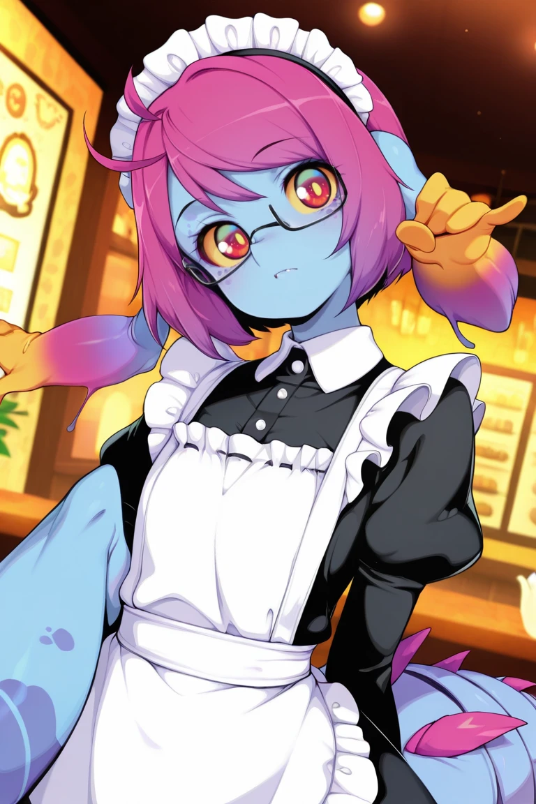 ctenophorae, blue skin, pink hair, yellow sclera, red eyes, spiked tail, arthropod limbs, monster feet, head arms,